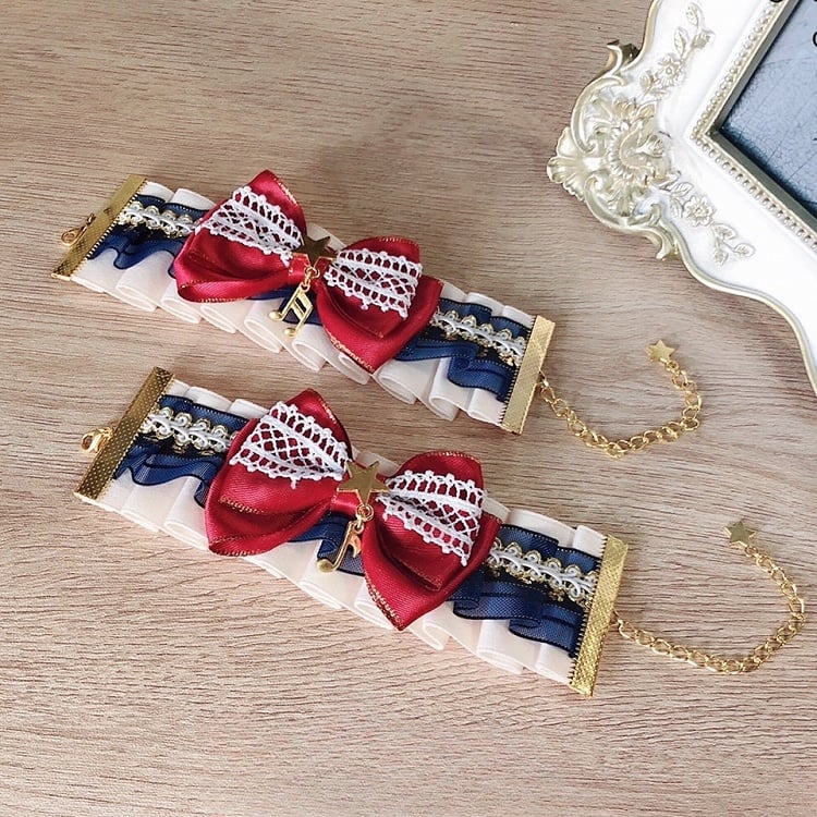 Rot-Blaue Schneewittchen-Vibes-Handgelenkmanschetten mit Schleife und Rüschenbesatz