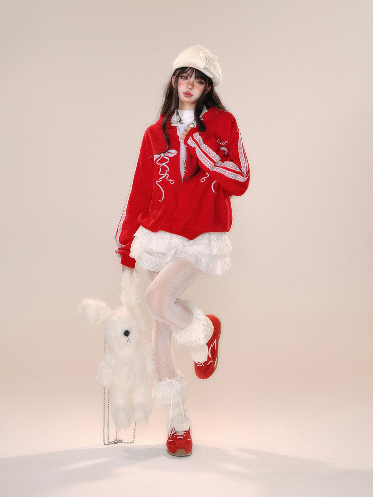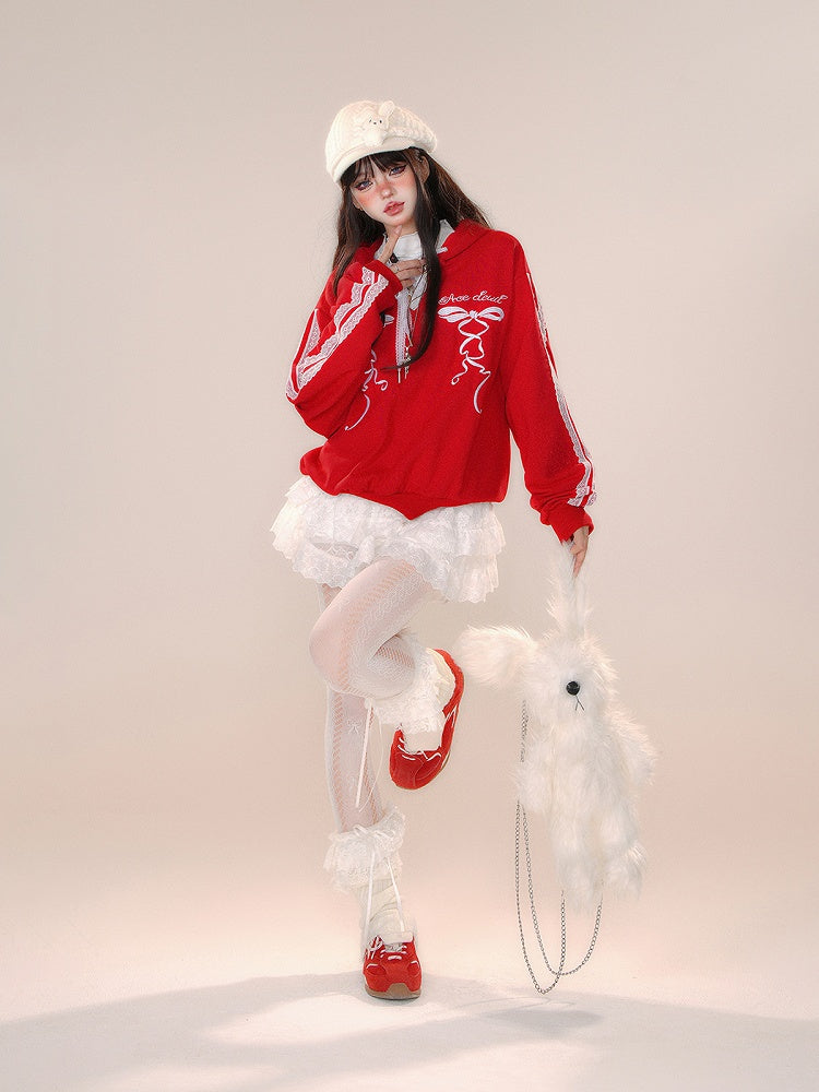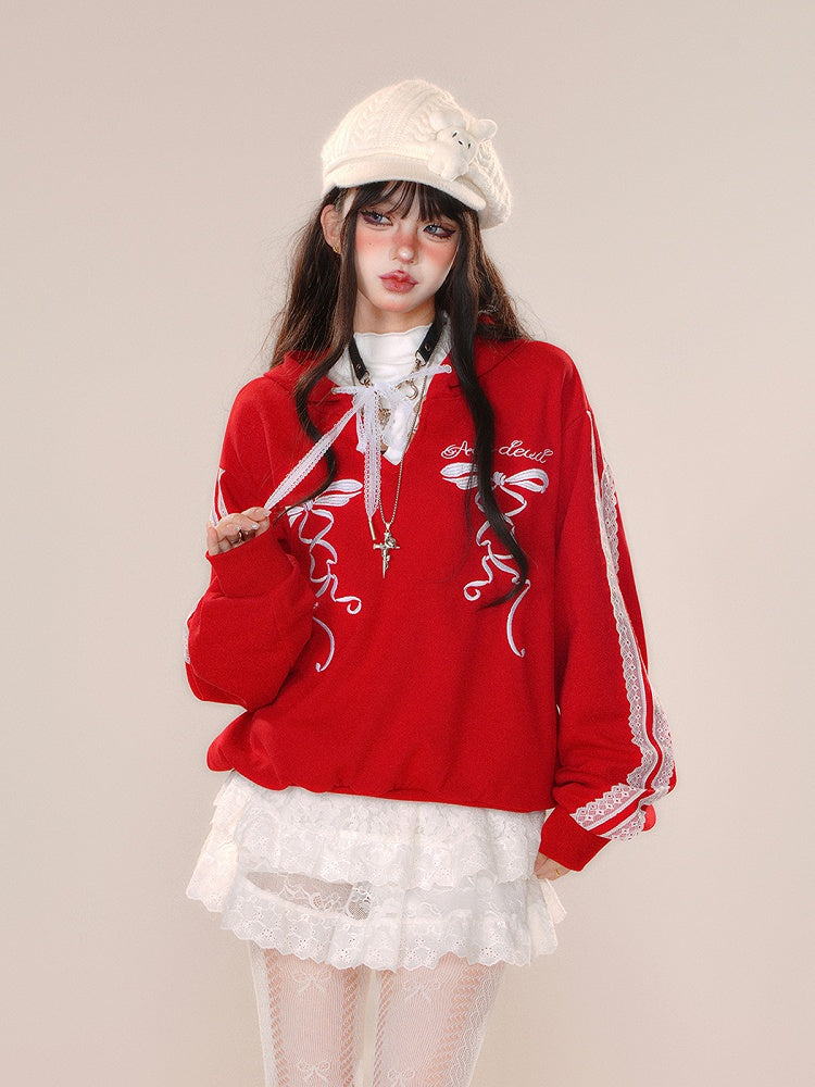 Roter Kapuzenpullover mit Schleifenstickerei und Schnürung