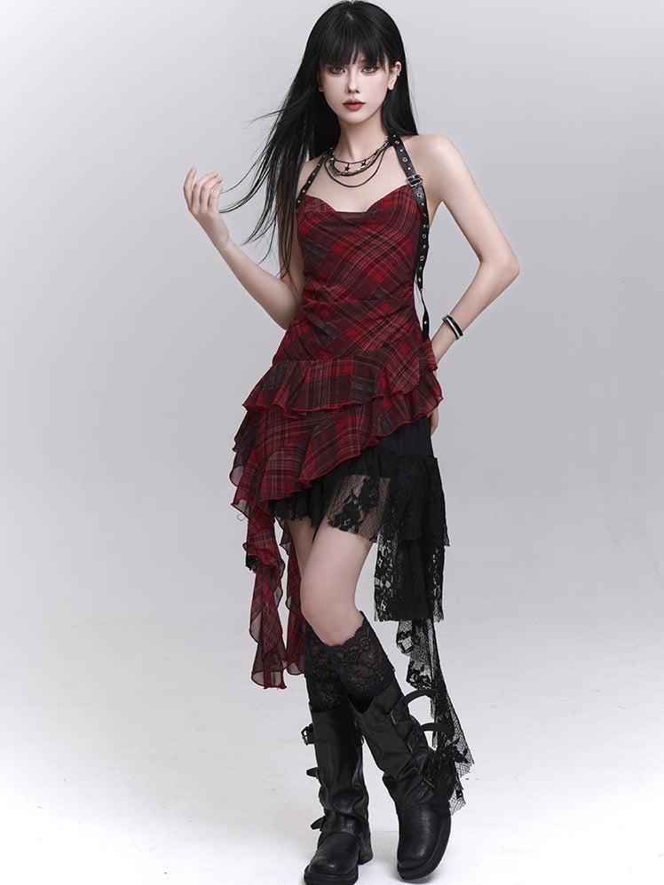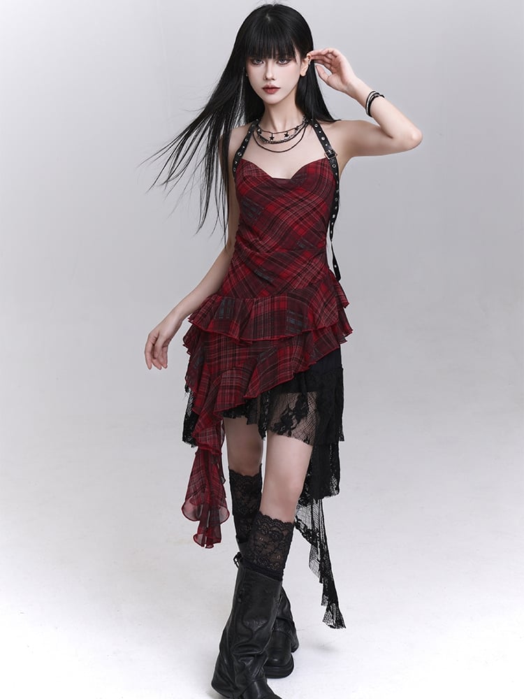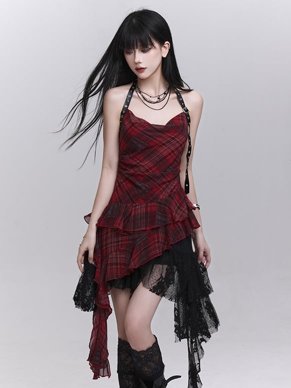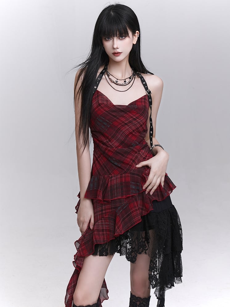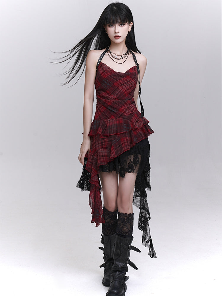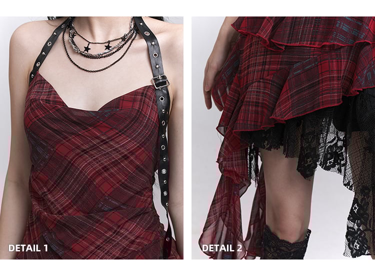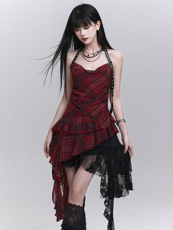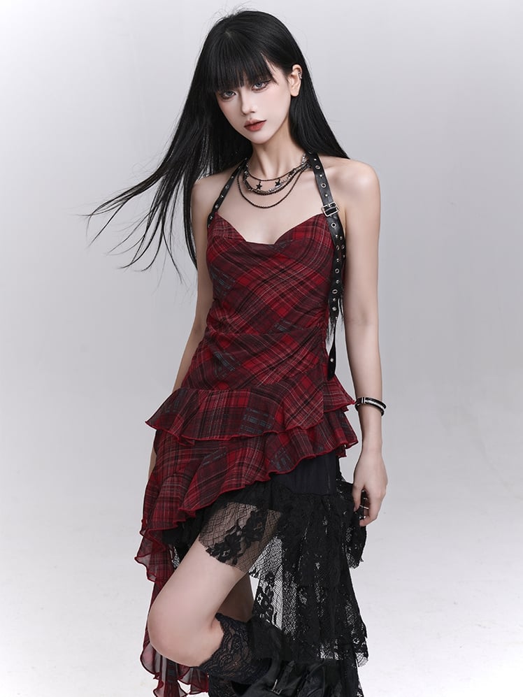 Rot kariertes Neckholder-Top mit kaskadierenden Rüschen und Schnallenriemen