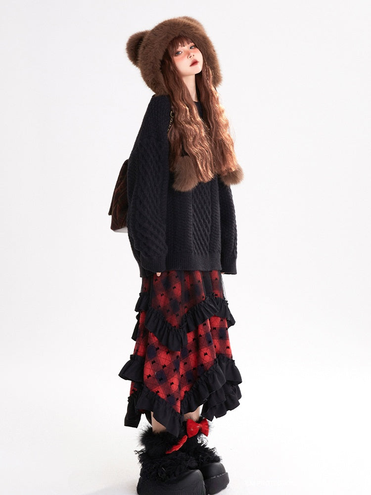 Y2K Rot kariertes Muster Asymmetrischer Rock mit Rüschensaum