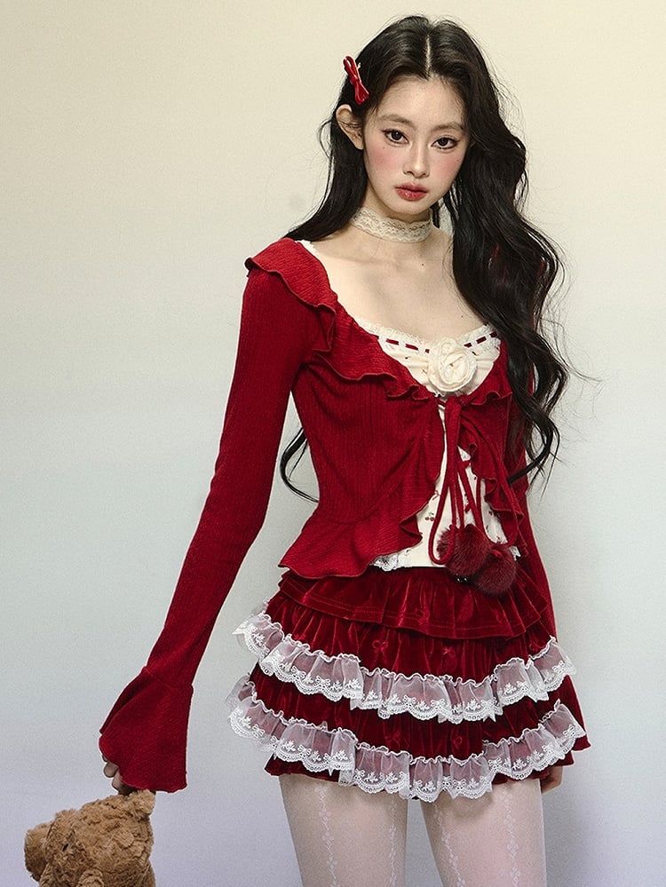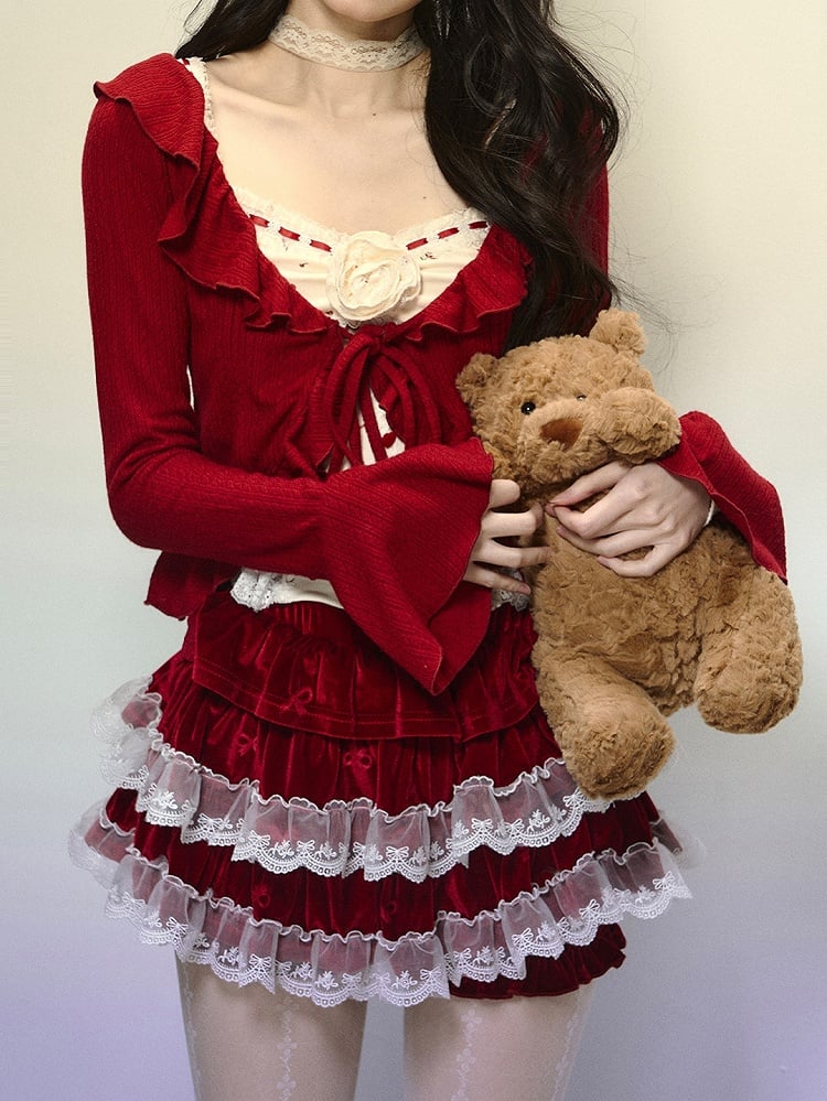 Diese bezaubernde Strickjacke mit schmeichelndem V-Ausschnitt und selbstbindenden Trägern sorgt für einen bezaubernden Look. Die kurze Länge und der Rüschenbesatz verleihen jedem Outfit einen Hauch von Niedlichkeit. Mit dieser roten Strickjacke bleiben Sie stilvoll und süß.