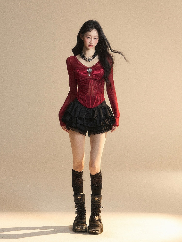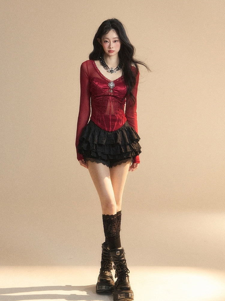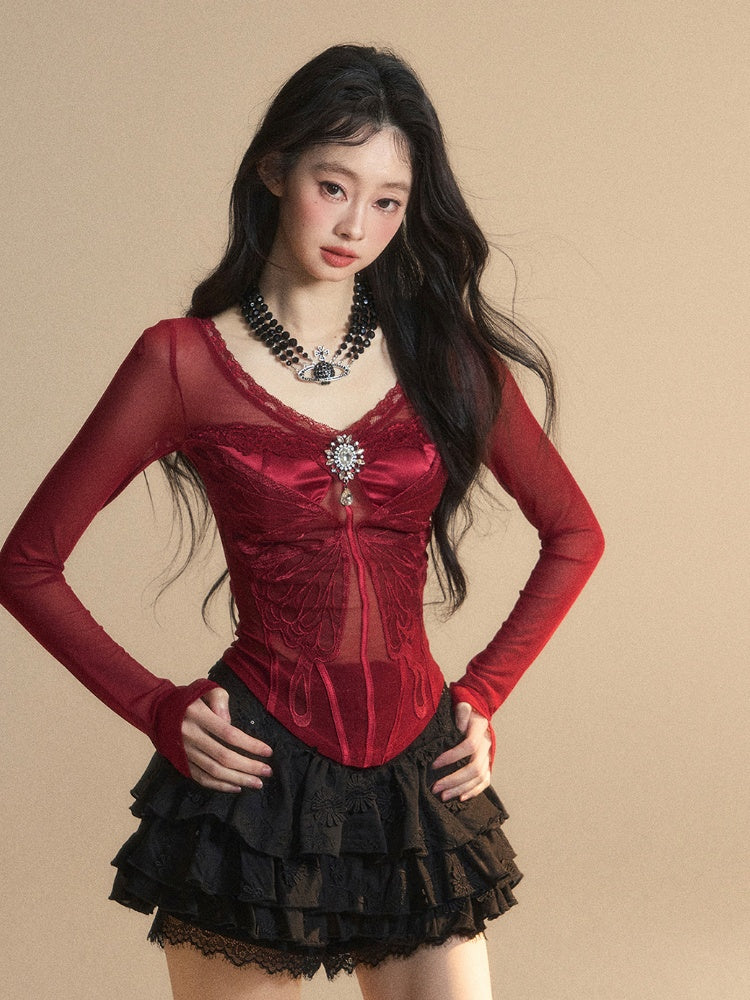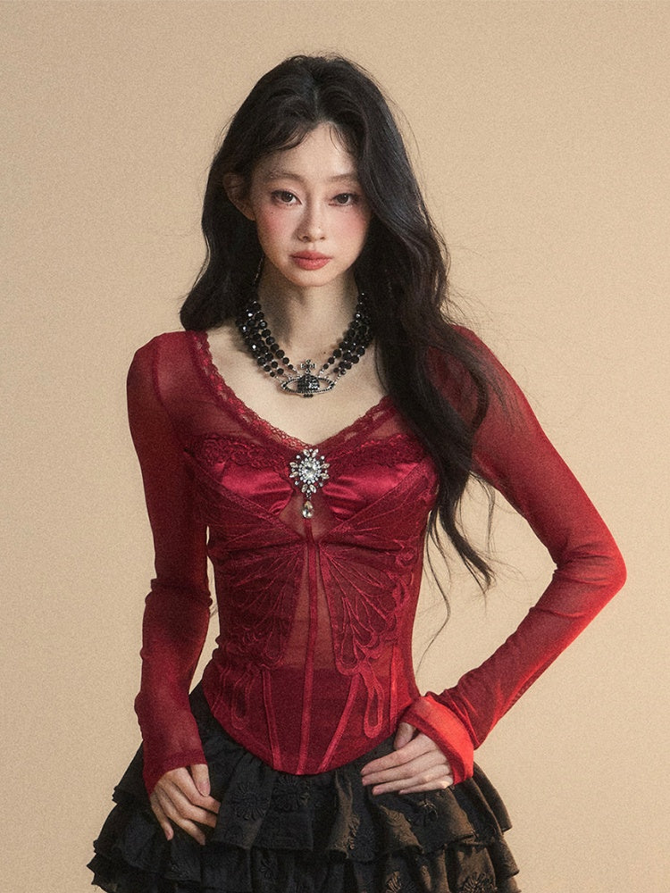 Rotes Top mit V-Ausschnitt und glamouröser Schmetterlingsstickerei mit Strassverzierung