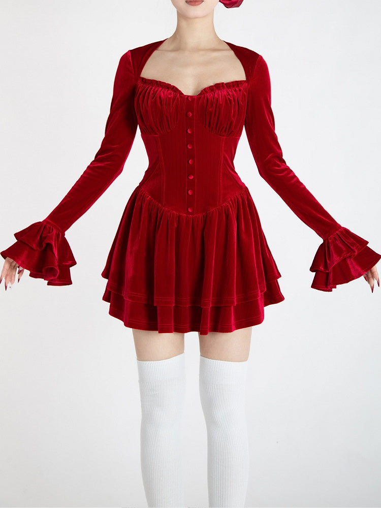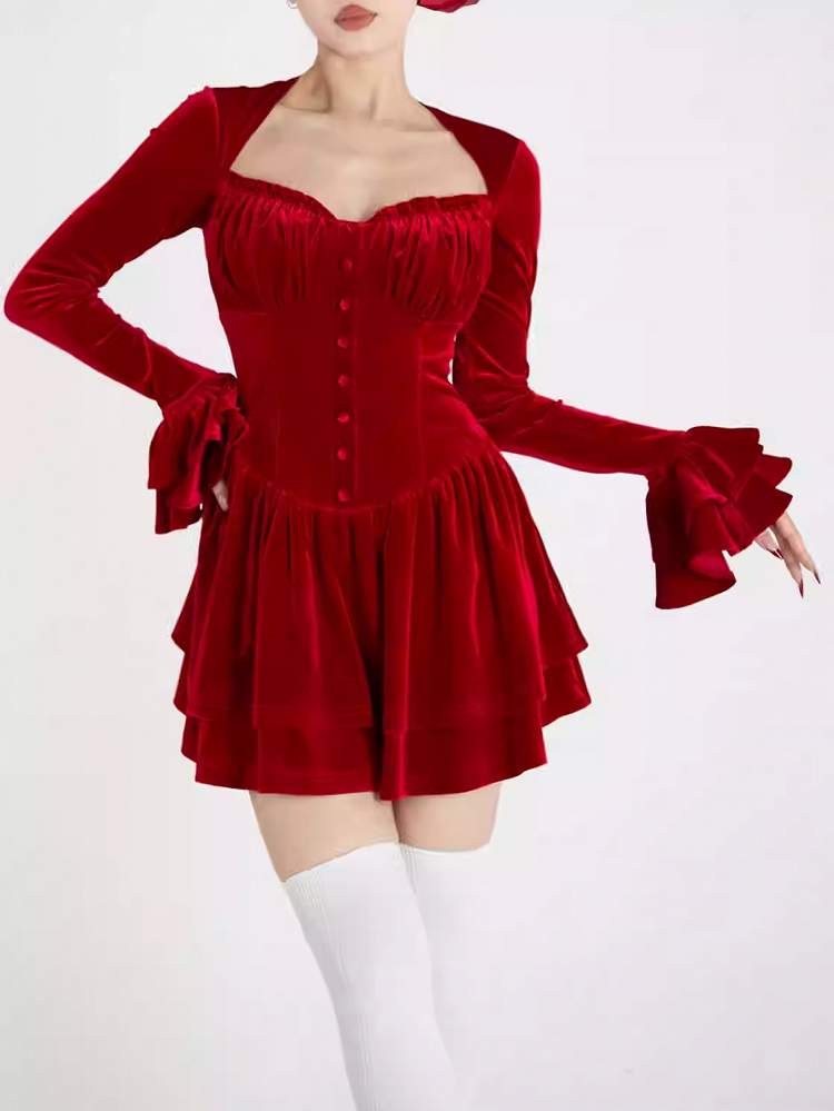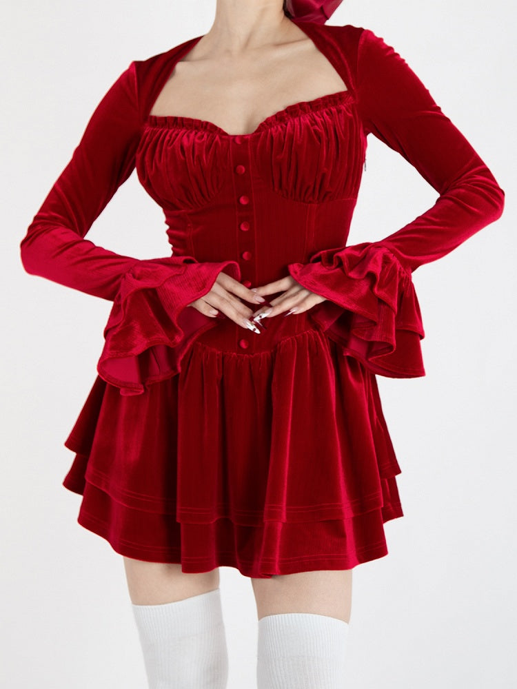 In unserem roten Samtkleid mit V-Ausschnitt und Glockenärmeln sehen Sie einfach bezaubernd aus! Der glamouröse Stufenrock und die Minilänge sorgen für einen einzigartigen, verspielten Look. Perfekt für einen Abend oder einen besonderen Anlass – dieses Kleid lässt Sie aus der Masse hervorstechen. Fühlen Sie sich die ganze Nacht über selbstbewusst und stilvoll.