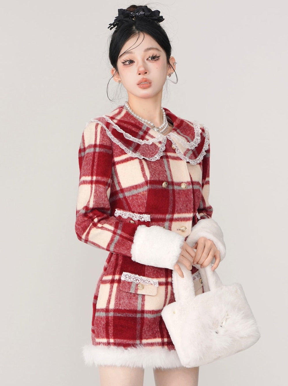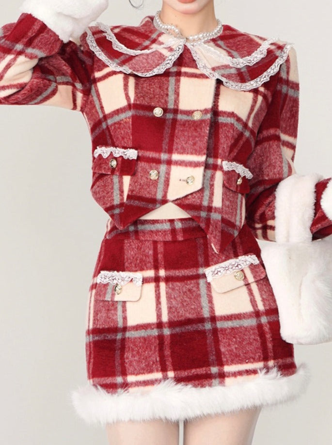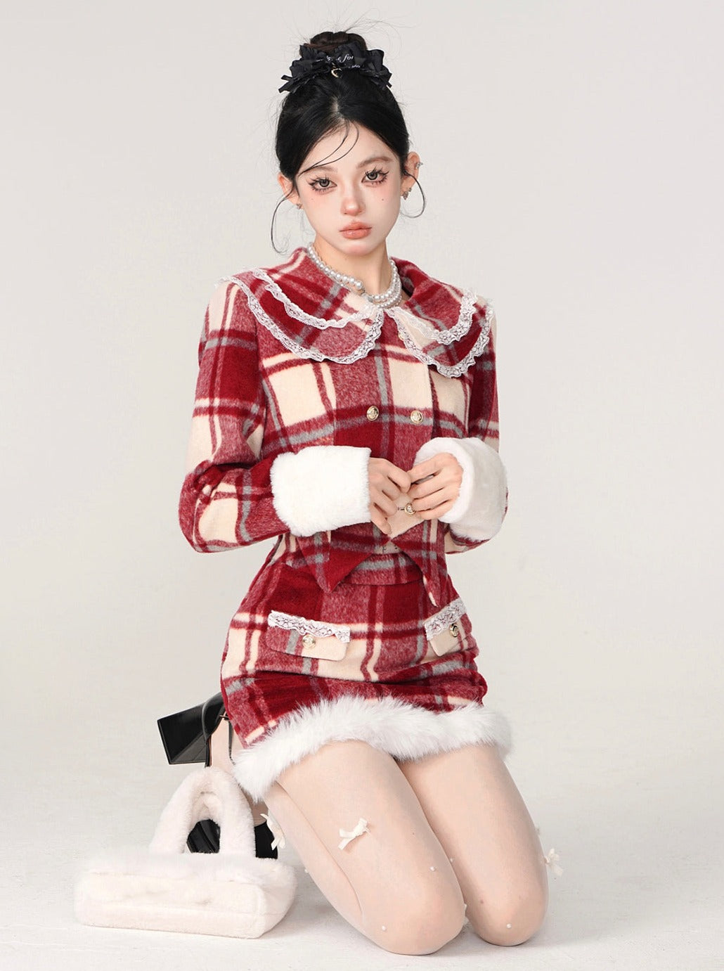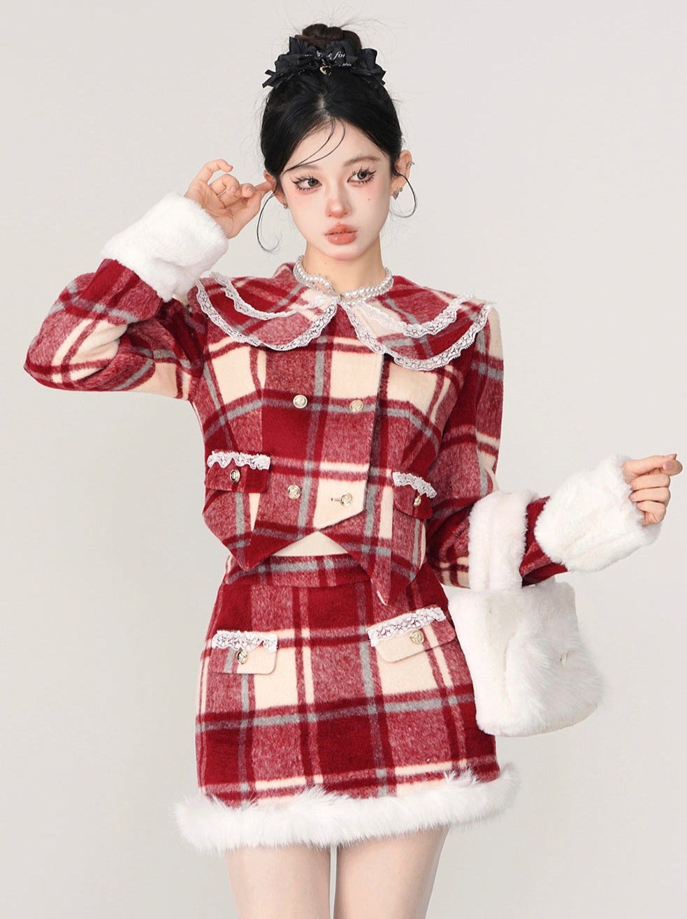 Retro-Jacke mit französischem Spitzenkragen und Karomuster + Doppelrock mit Pelzkaro