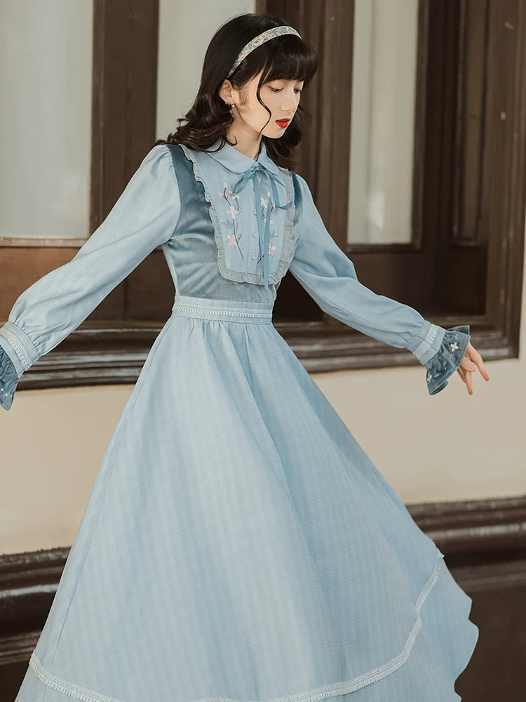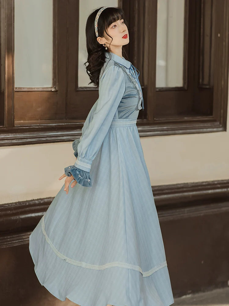 Blau-weißes Old School Lolita Fashion Kleid mit Schleife und Details, JSK-Set