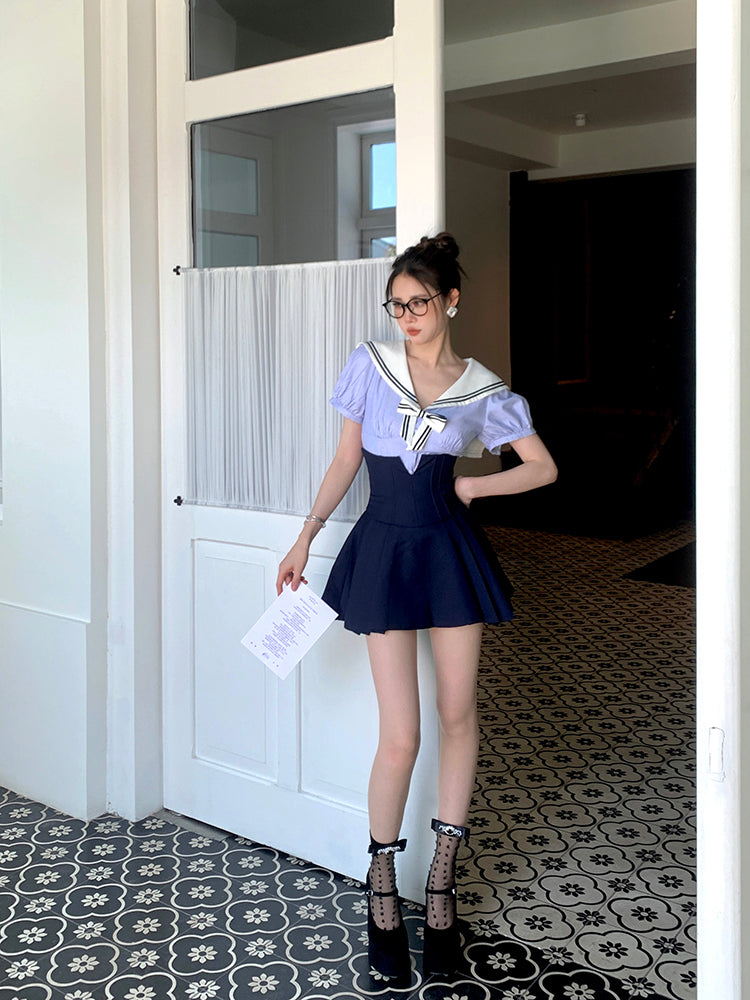 Blau-weißes Old School Lolita Fashion Kleid mit Schleife und Details, JSK-Set