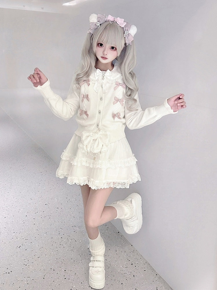 White Jirai Kei Knit Cardigan with Pink Bows & Square Rhinestone Button Front