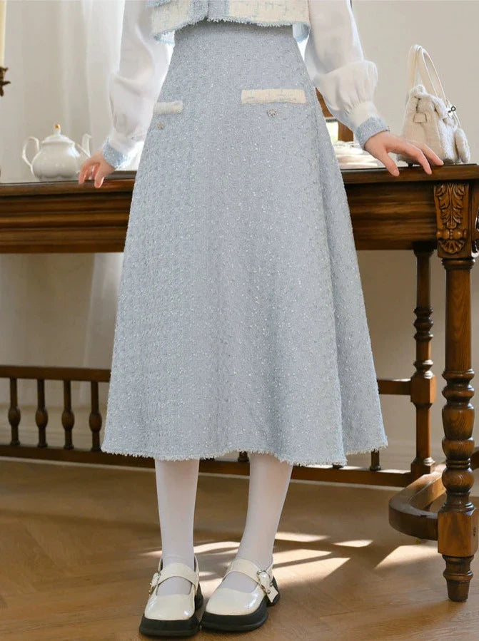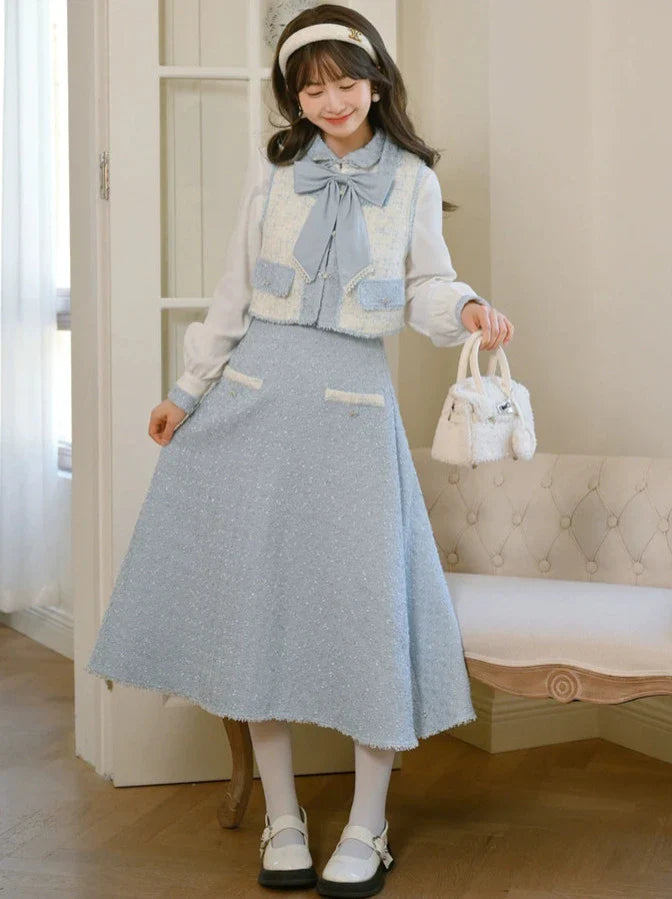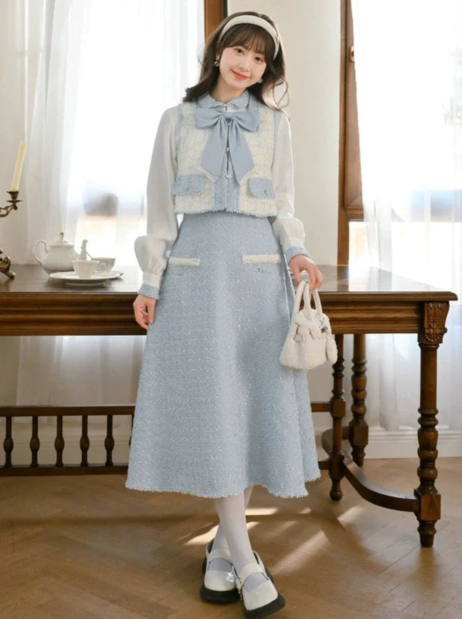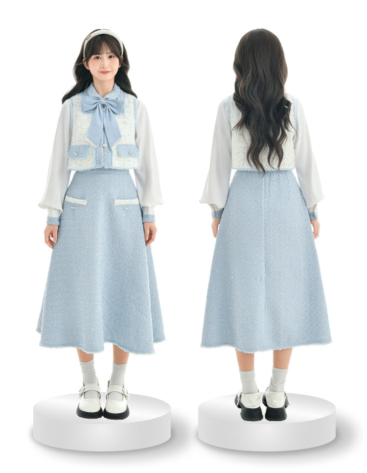 Dieses bezaubernde Kostüm besteht aus einem blauen Rock, einer Tweedweste und einem Hemd, die alle mit einem zarten Band verziert sind. Das Tweedmaterial verströmt einen dezenten Duft und ist somit perfekt für jeden Anlass. Vervollständigen Sie Ihren Look mit diesem charmanten Outfit.