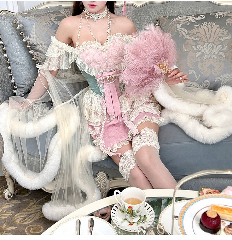 Rosa Rosen, herzförmiger Ausschnitt, grünes Korsett-Top + rosa Skort, Rokoko-Outfit