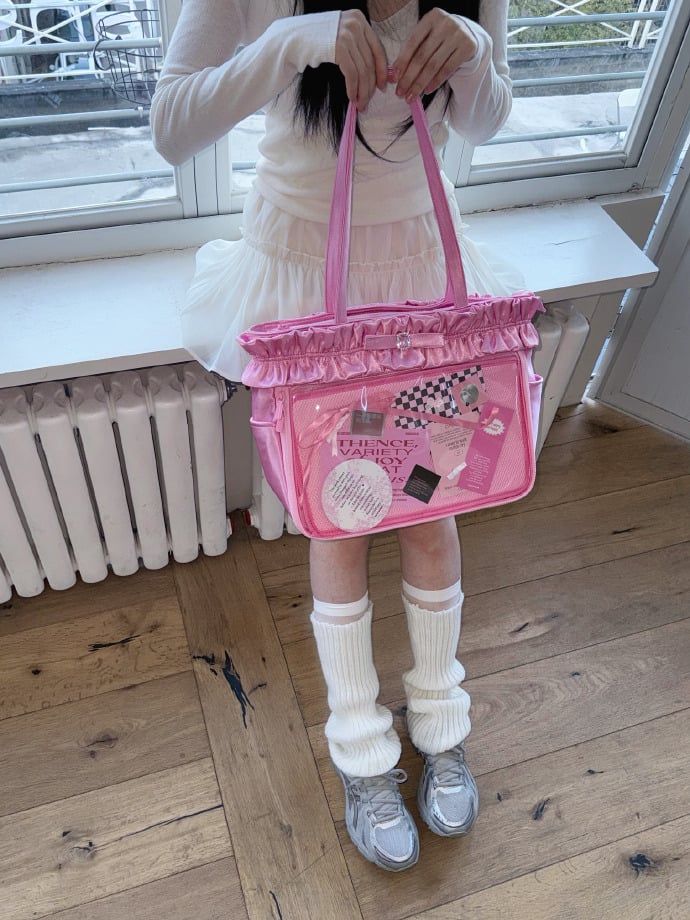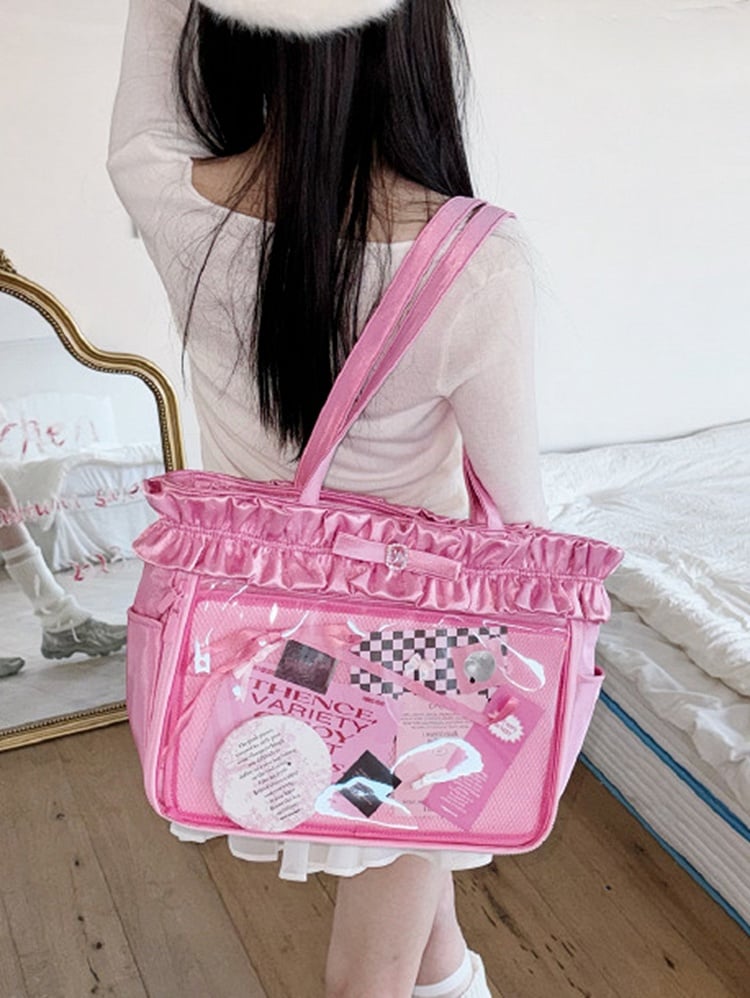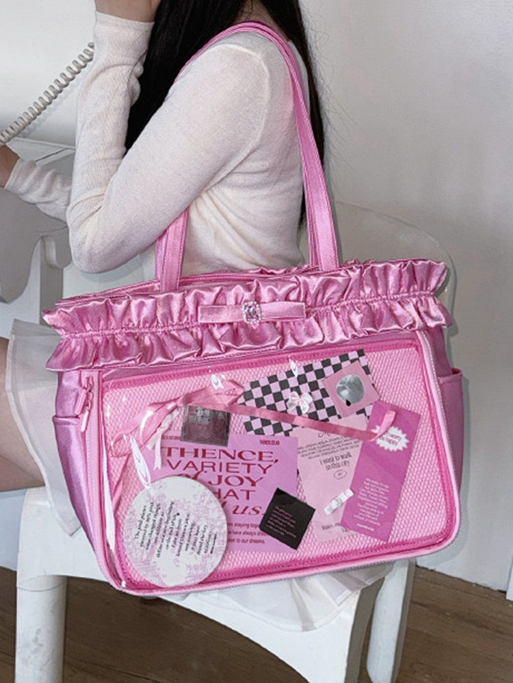 Diese bezaubernde rosarote Ita-Tragetasche mit Rüschenbesatz und Strassschleife ist stilvoll und funktional zugleich. Mit ihrem süßen Rüschenbesatz und der Strassschleife verleiht diese Tragetasche jedem Outfit einen Hauch von Charme. Ihr geräumiger Innenraum und die robuste Konstruktion machen sie zu einer praktischen und zuverlässigen Wahl für den Transport all Ihrer wichtigen Dinge.