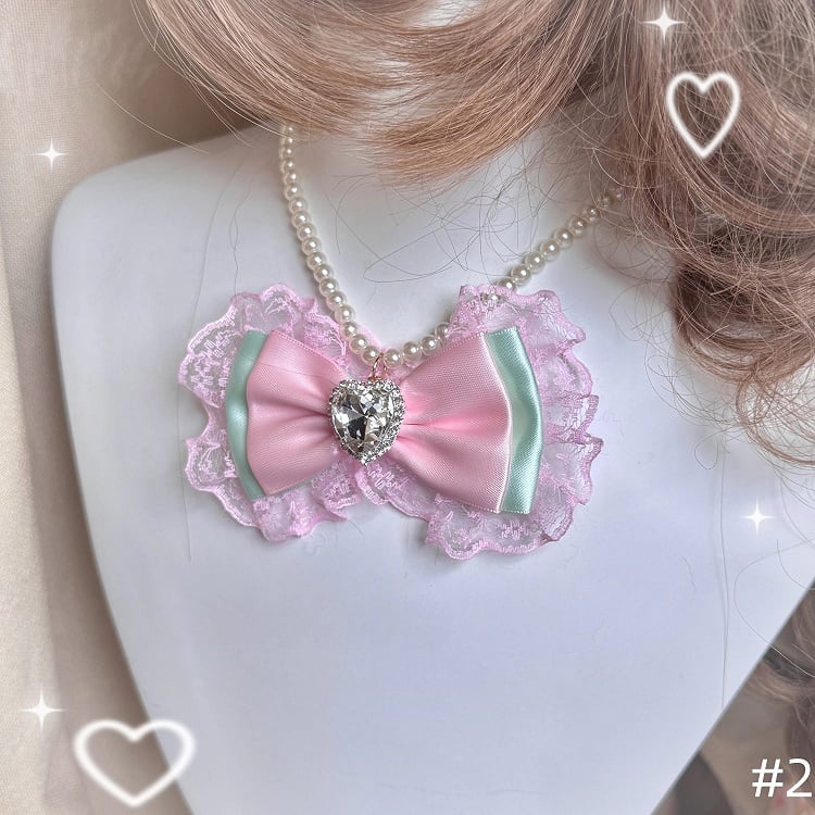 Hime Gyaru Fashion Pink & Mint Sweet Style Accessories with Rose, Bow, Pearl Chain – Hairclips, Necklace & Ring Collection