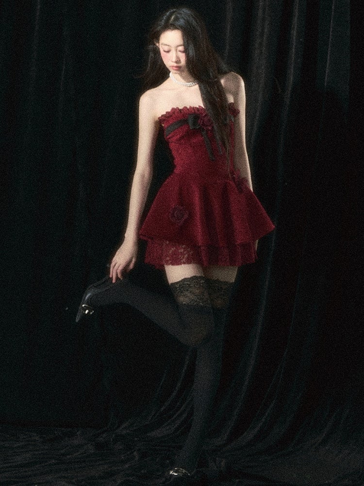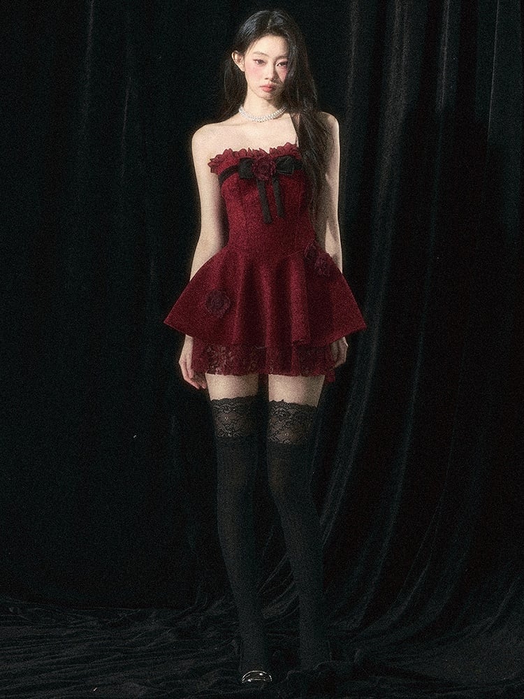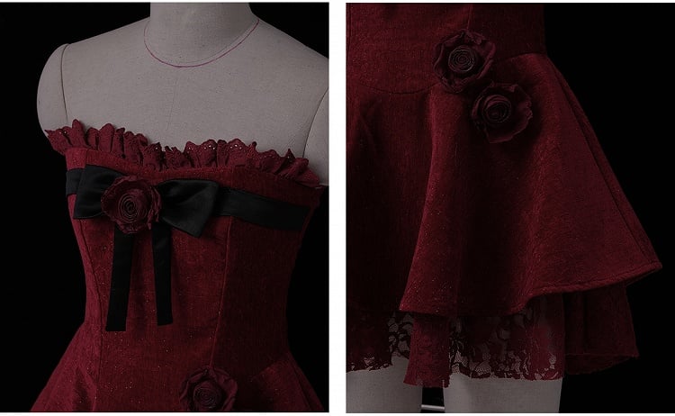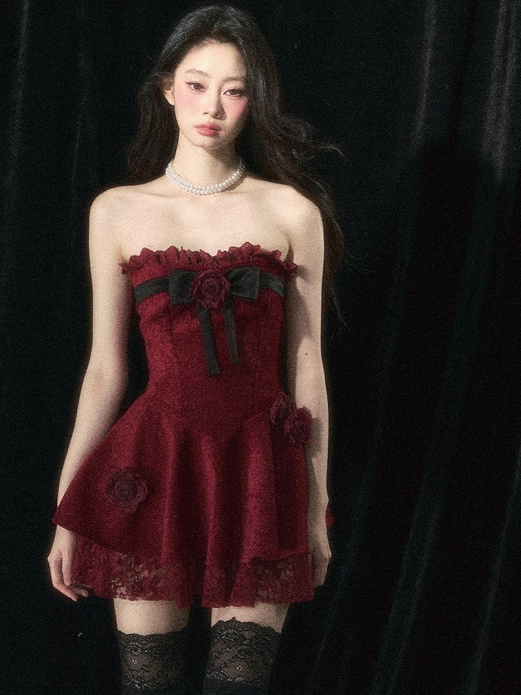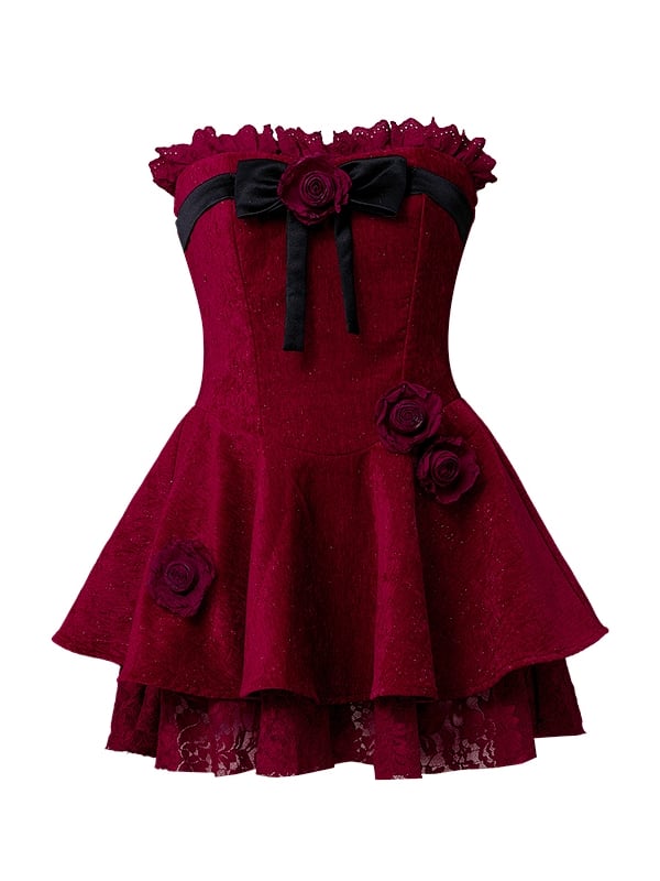 Weinrotes trägerloses Kleid mit Rosenverzierungen und Plüschschal-Set