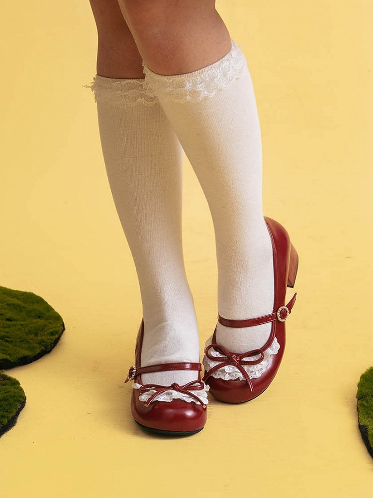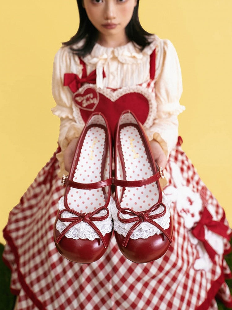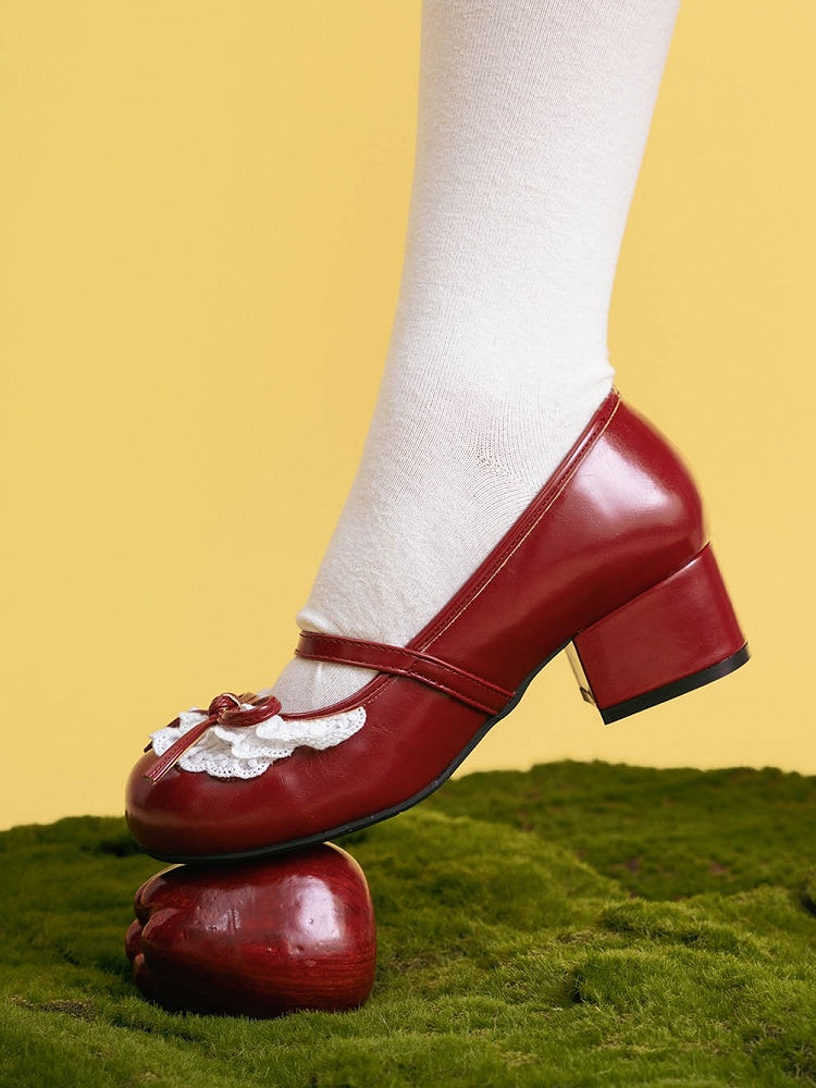 Rote Mary Janes mit geknoteter Schleife und Spitzenbesatz, 2,2 cm/4,3 cm Absatz, runde Zehenpartie