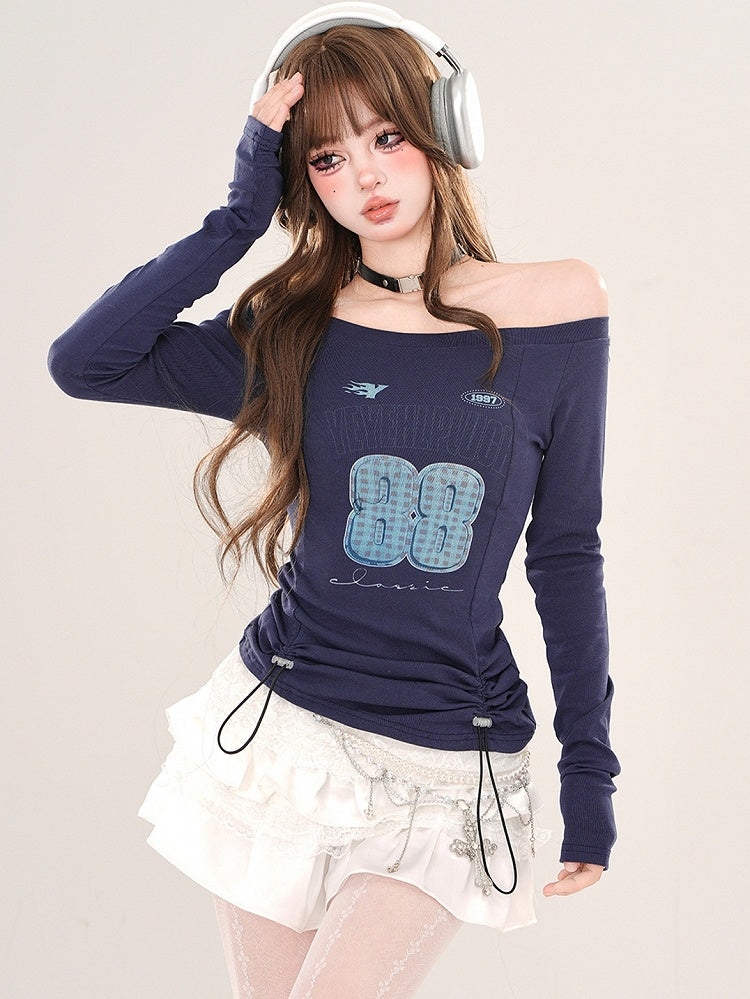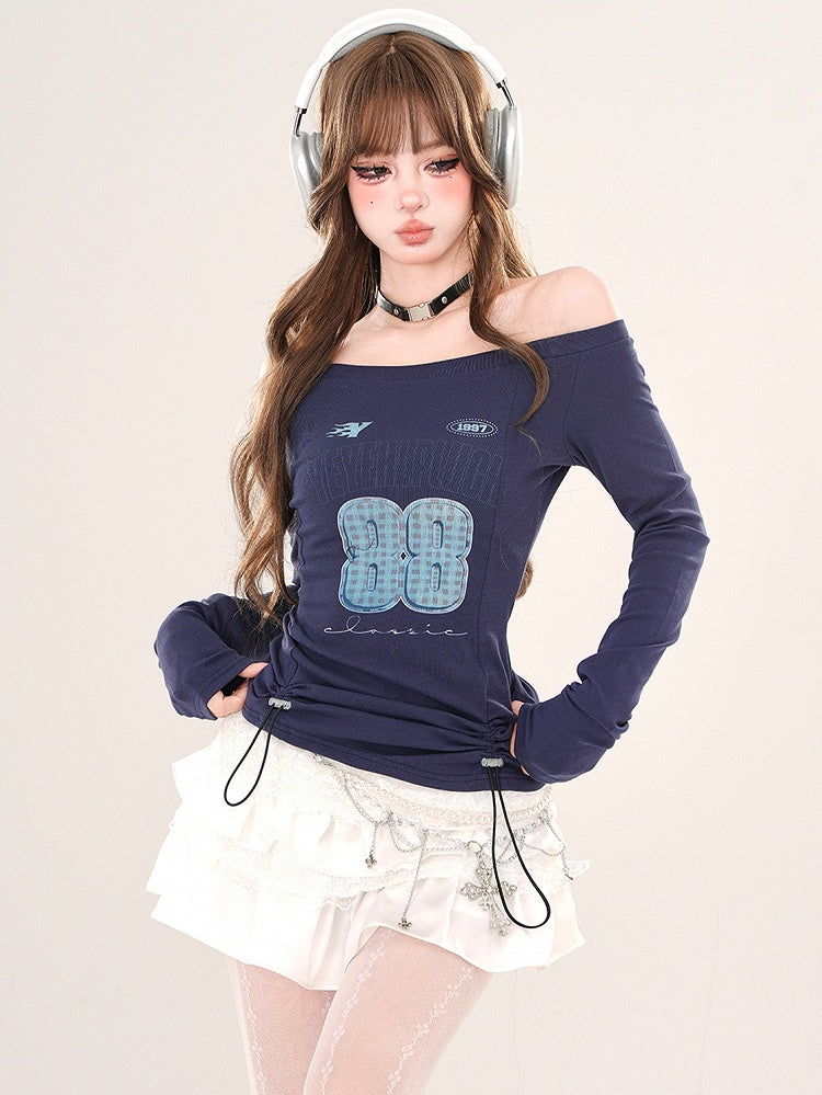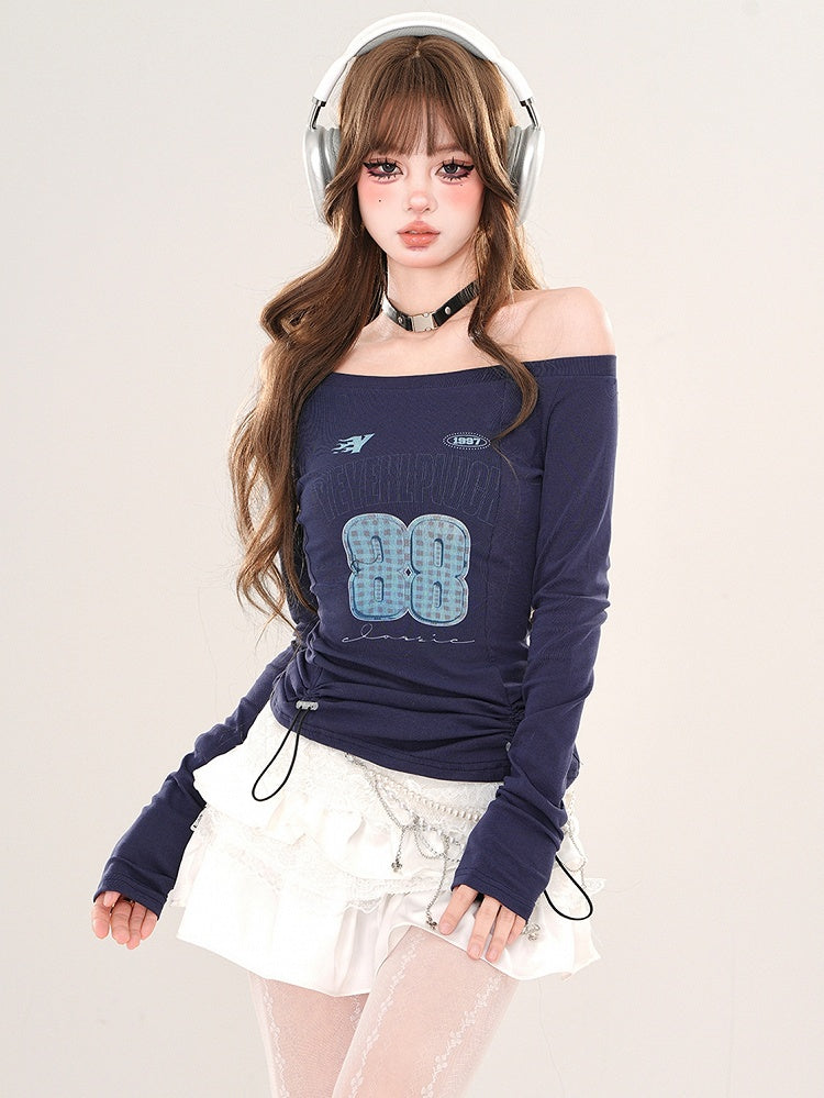 Dieses schulterfreie Top in bezauberndem Königsblau besticht durch einen lustigen Zahlendruck und einen Kordelzug in der Taille für eine perfekte Passform. Bleiben Sie stilvoll und zeigen Sie gleichzeitig Ihre verspielte Seite.