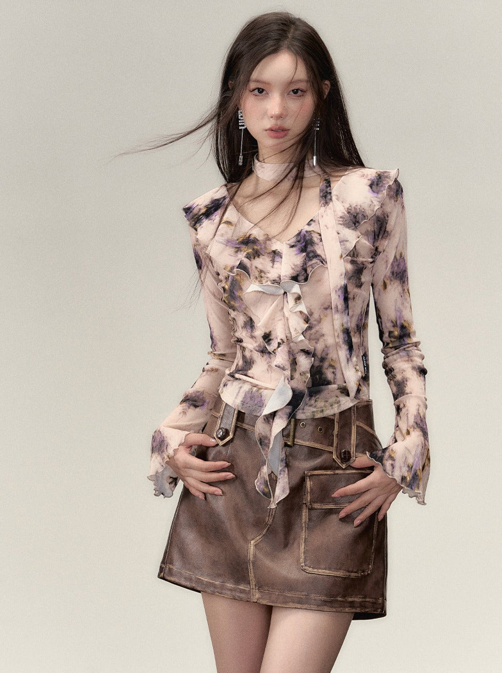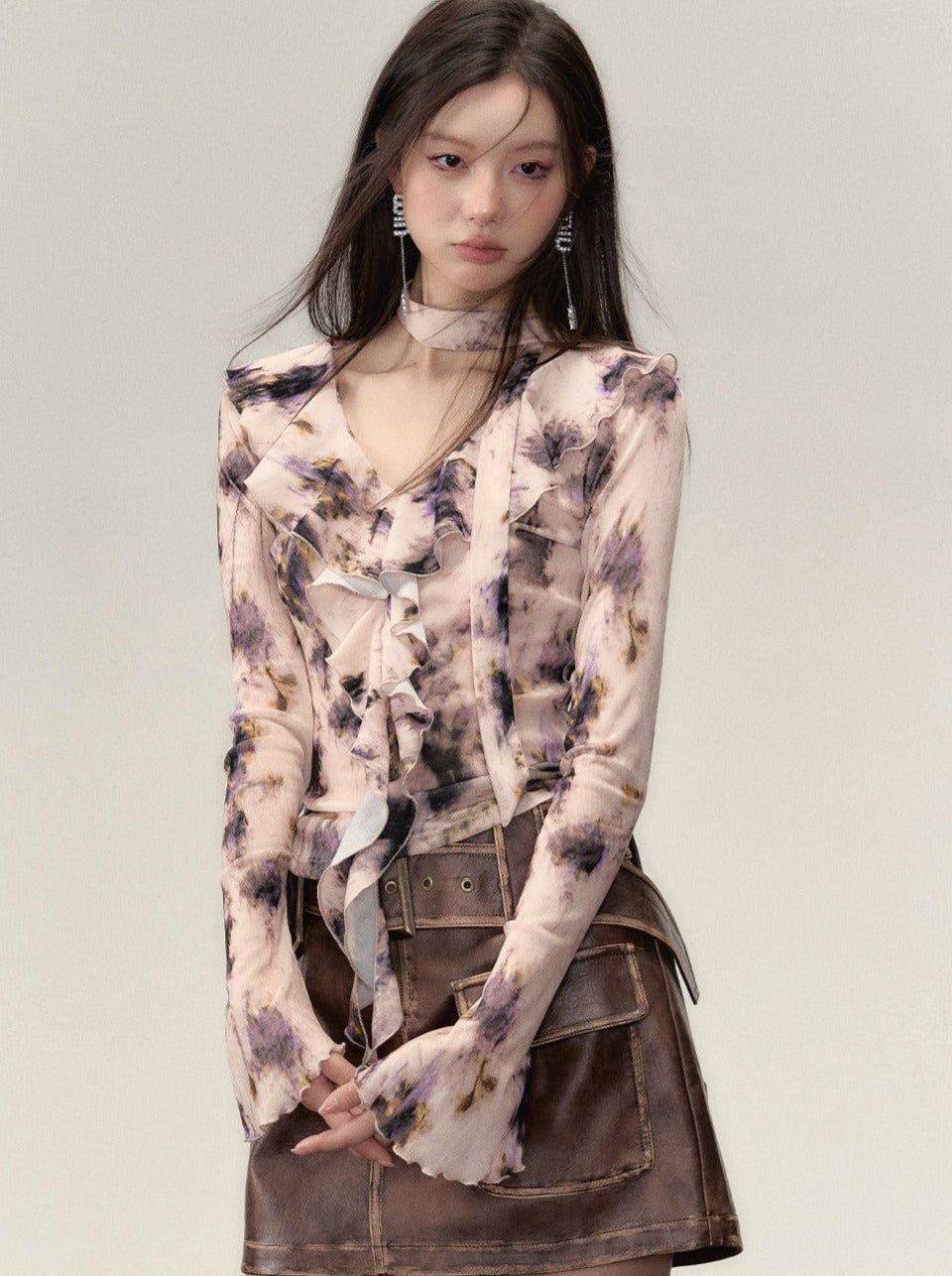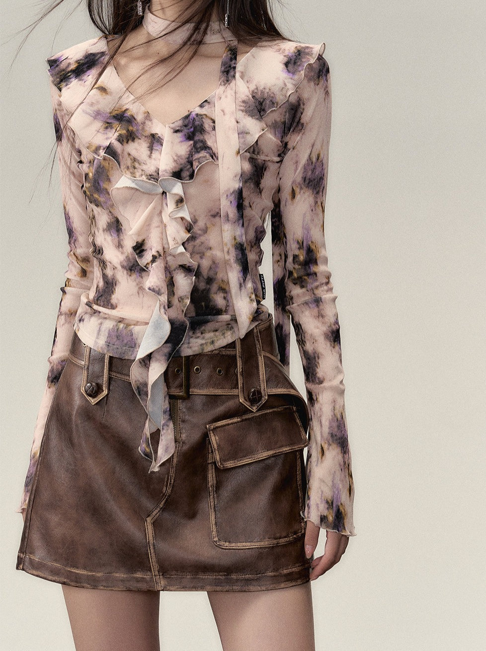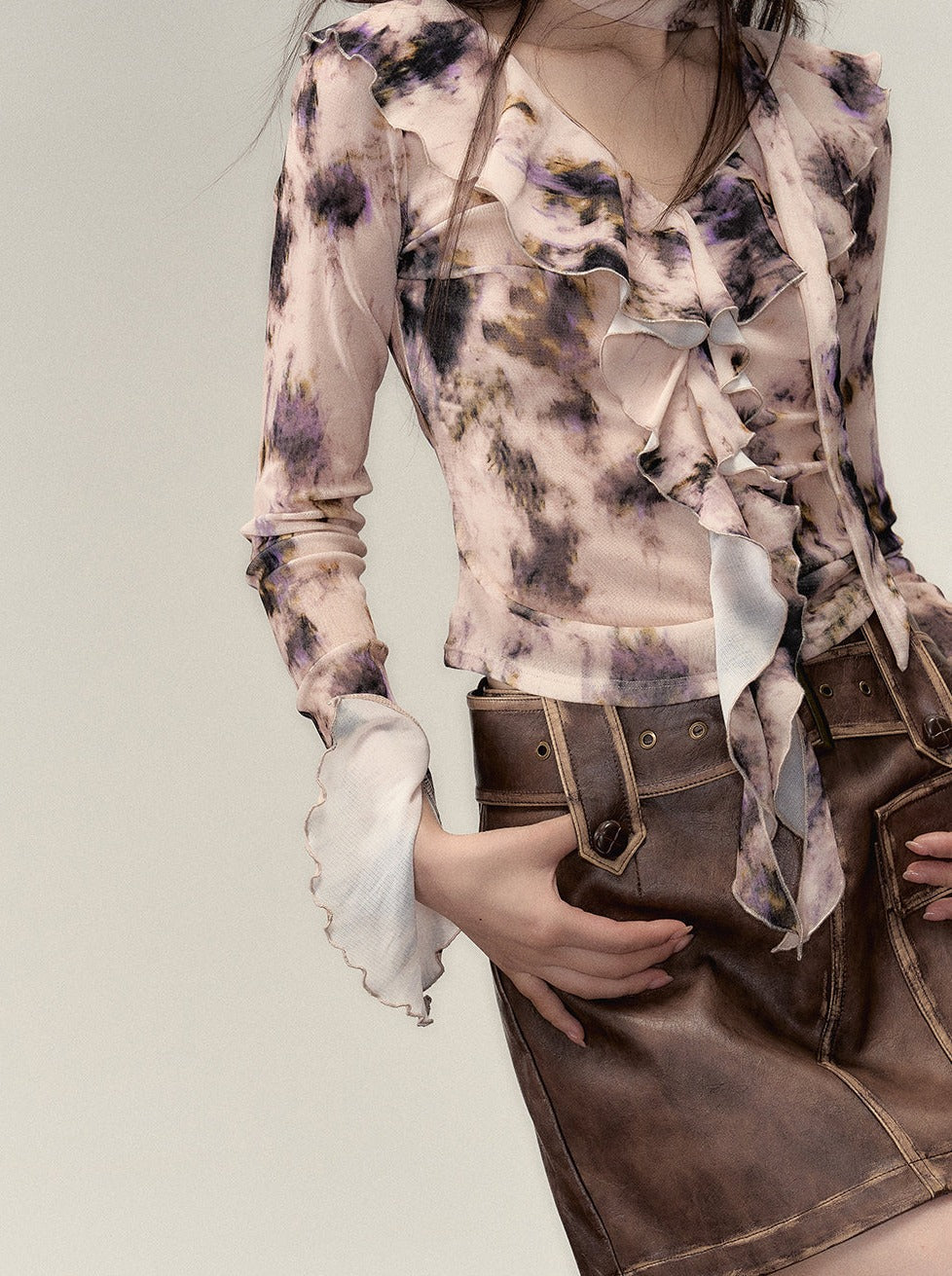 Nischen-Top mit V-Ausschnitt und Rüschendesign