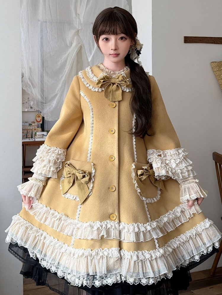 Ginger Sweet Lolita Winter Coat with Ruffled Lace Details and Bow Accents
