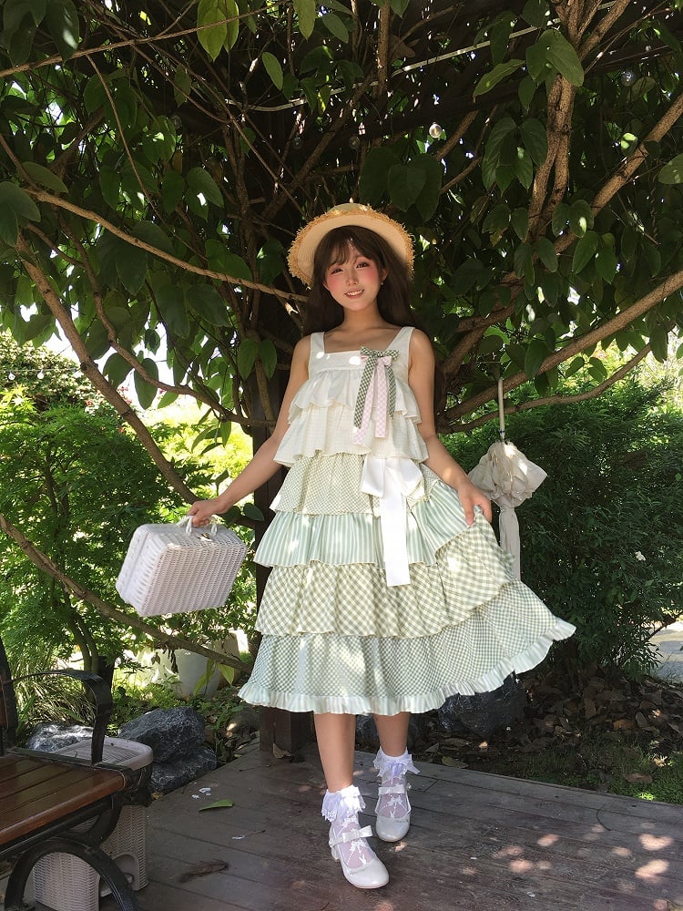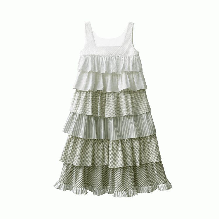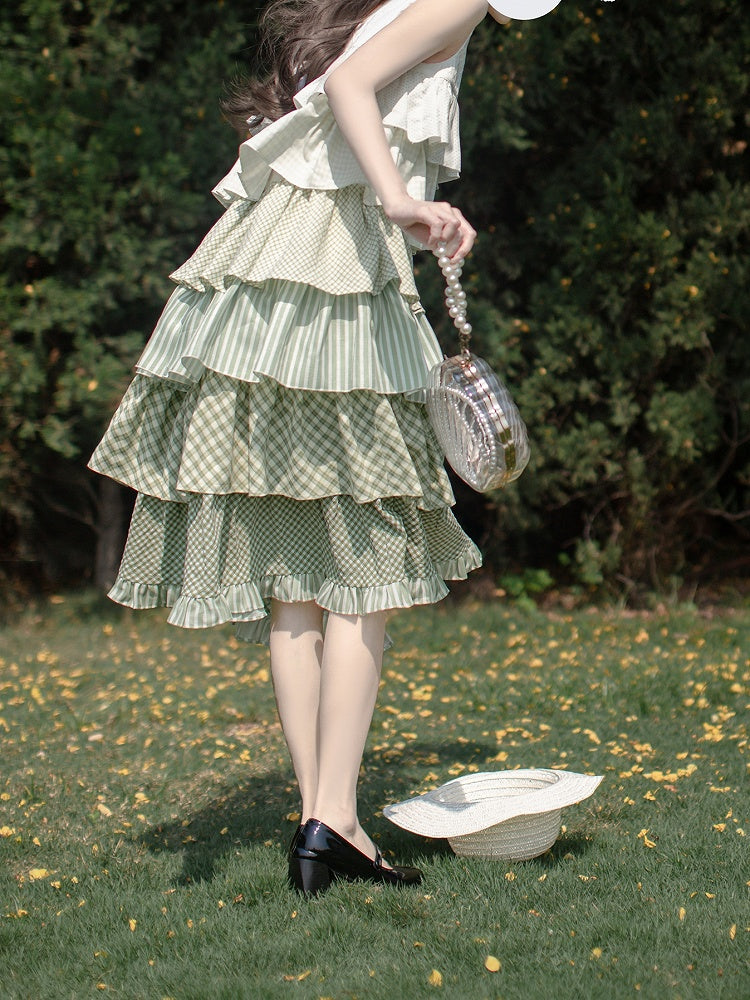 Rüschen gestuft mit Mori Kei Grün Patchwork Ärmelloses Kleid