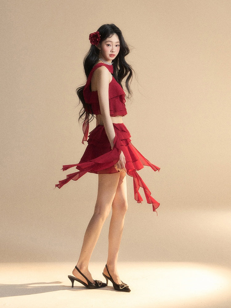 Schal, roter Chiffon-V-Ausschnitt mit gestuftem, freiem Rüschen-Crop-Cami-Top