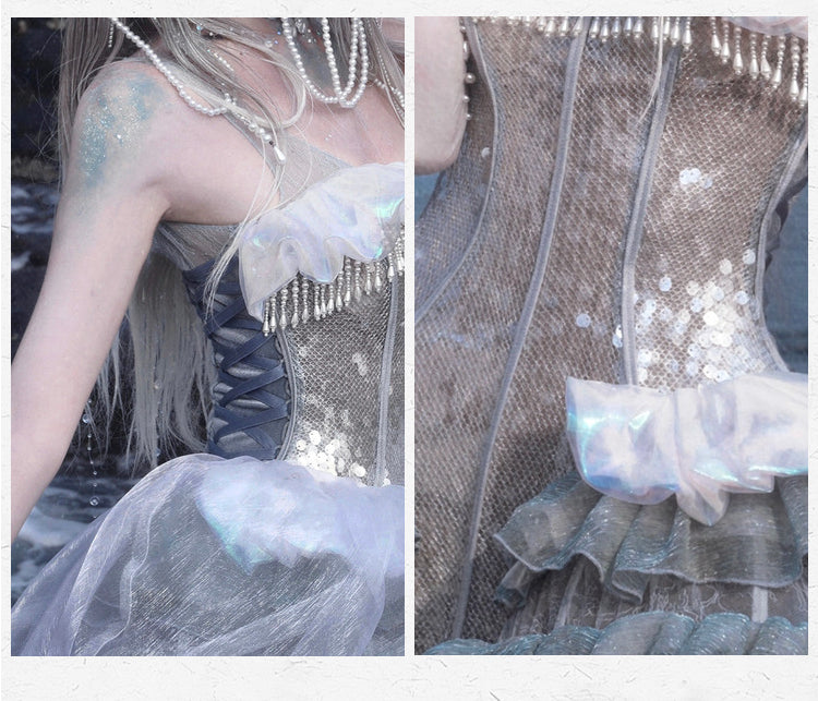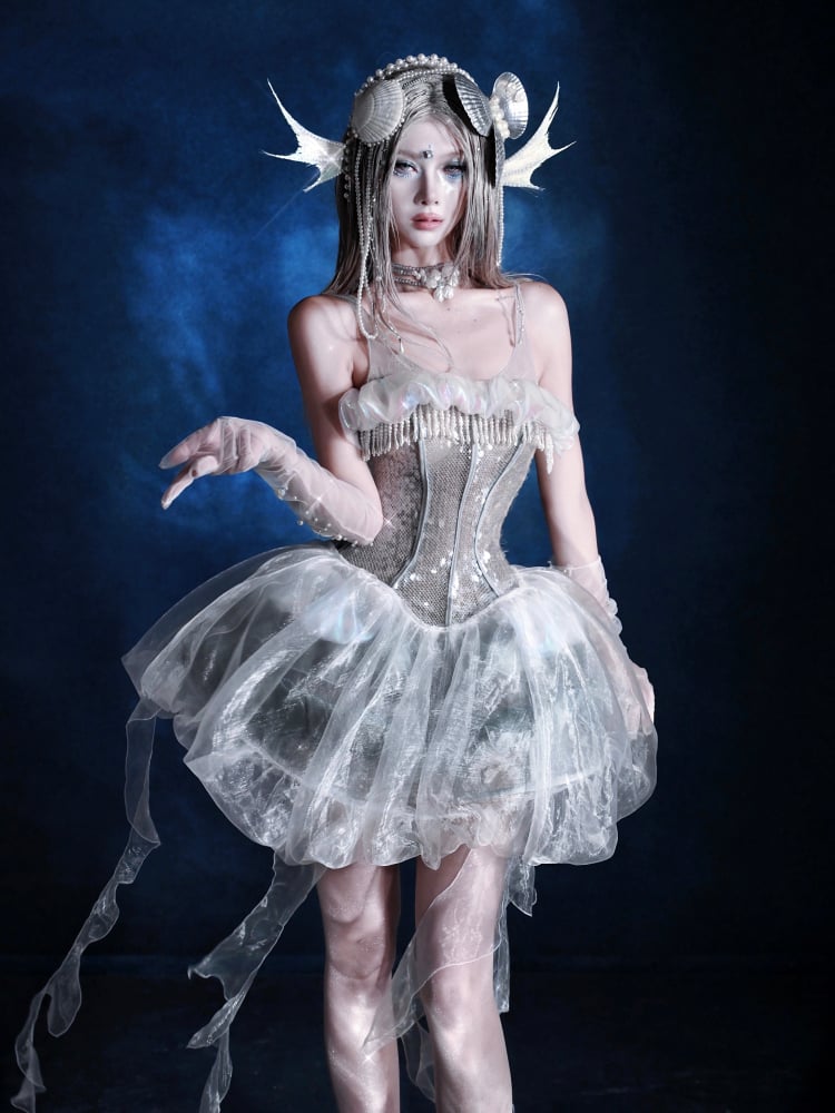 Korsettkleid mit Vogelkäfig-Design, Saum, glänzenden Pailletten und Stäbchen + Quallen-Overlay