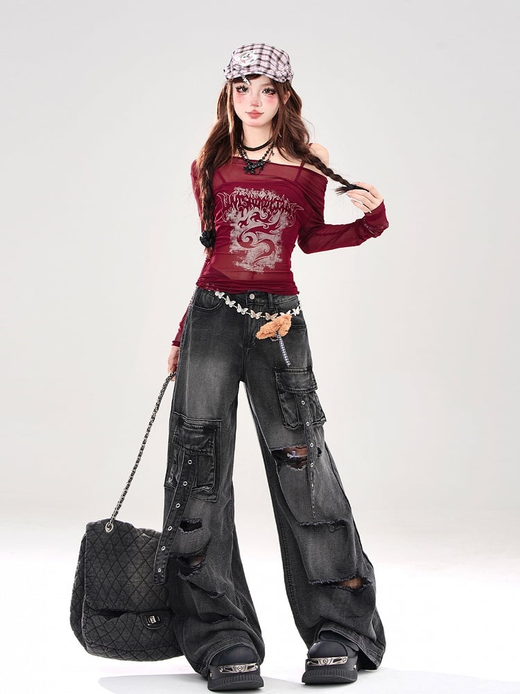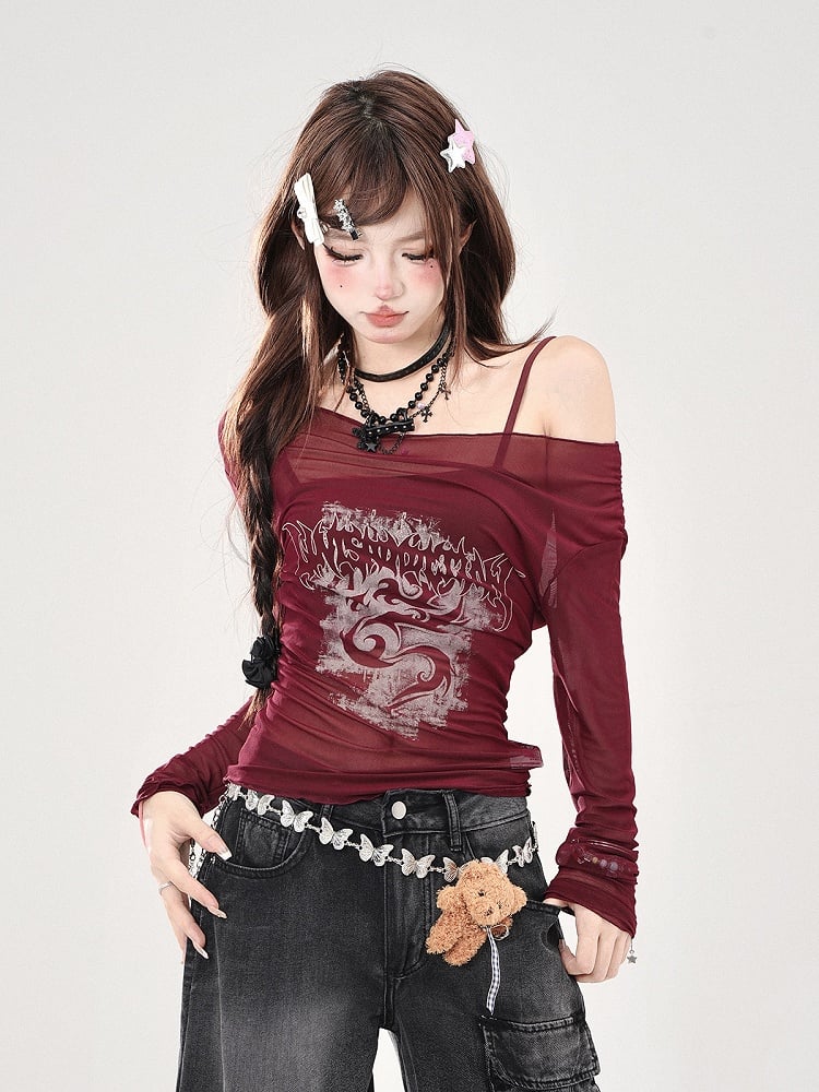 Red Sheer Off-Shoulder Sun Protection Top Set