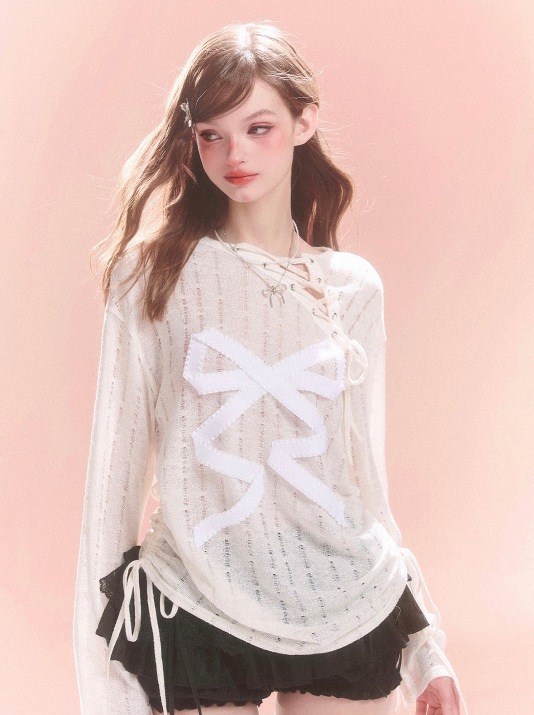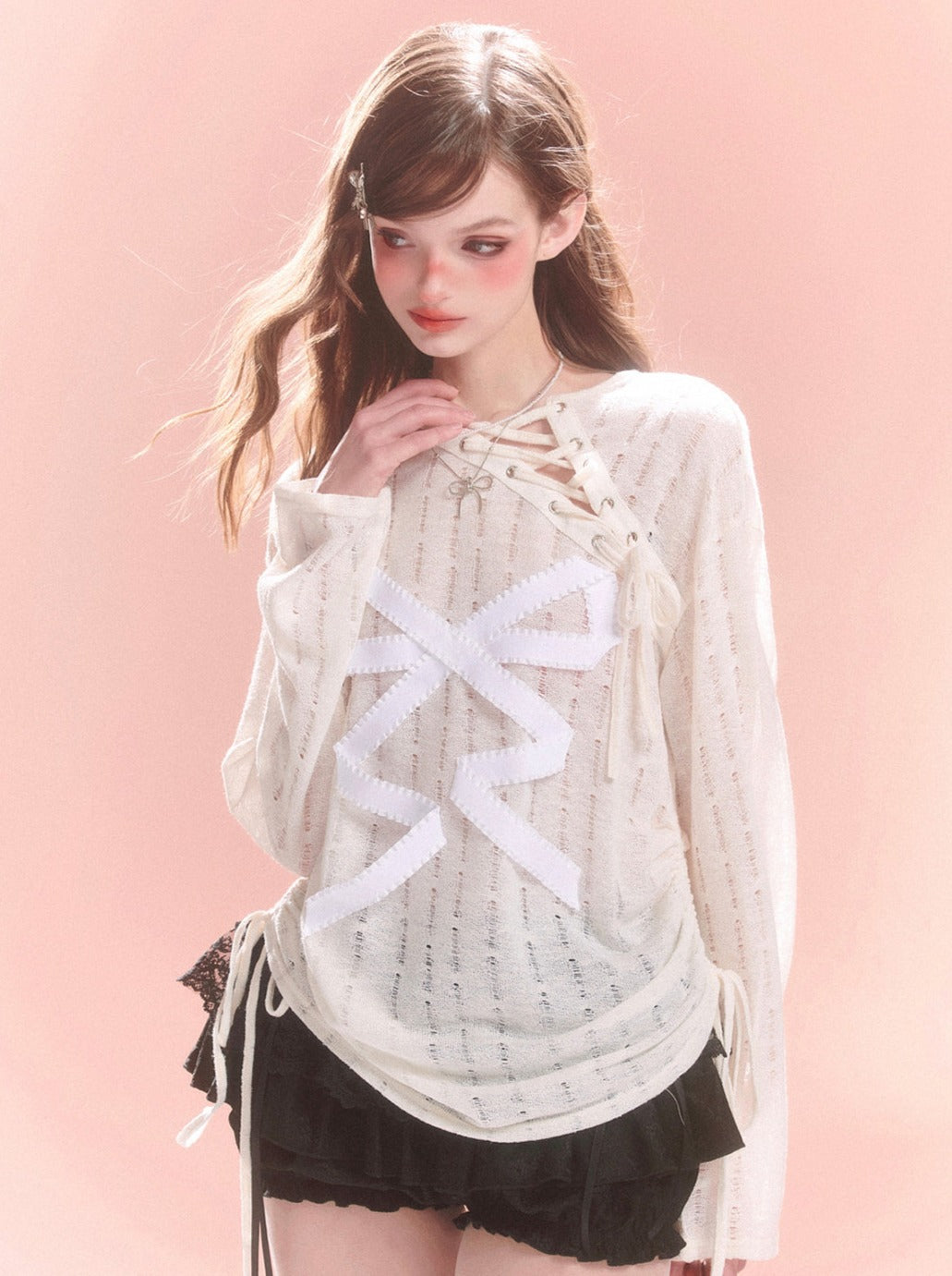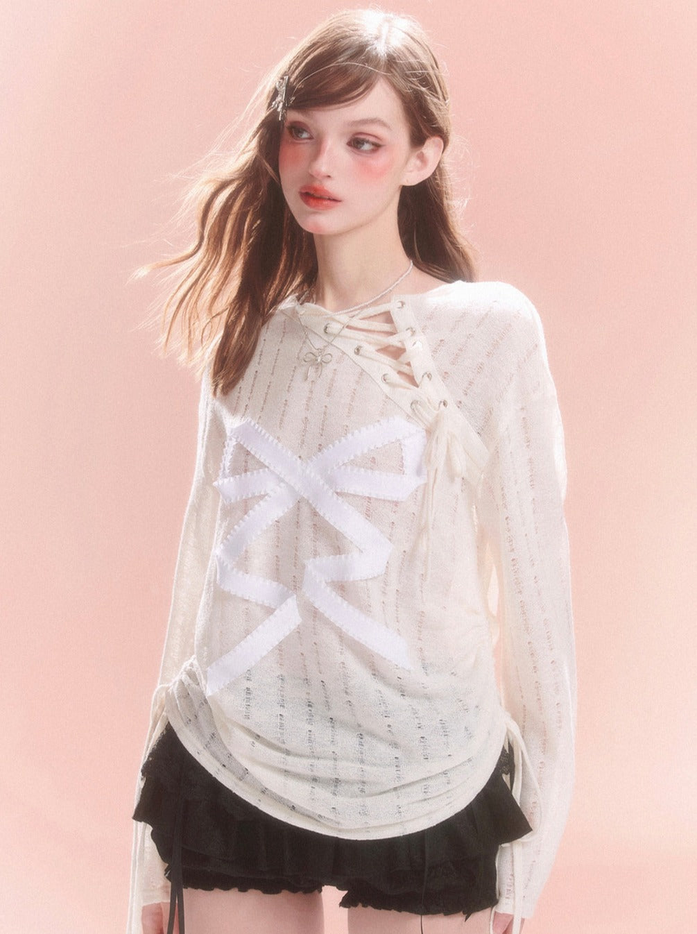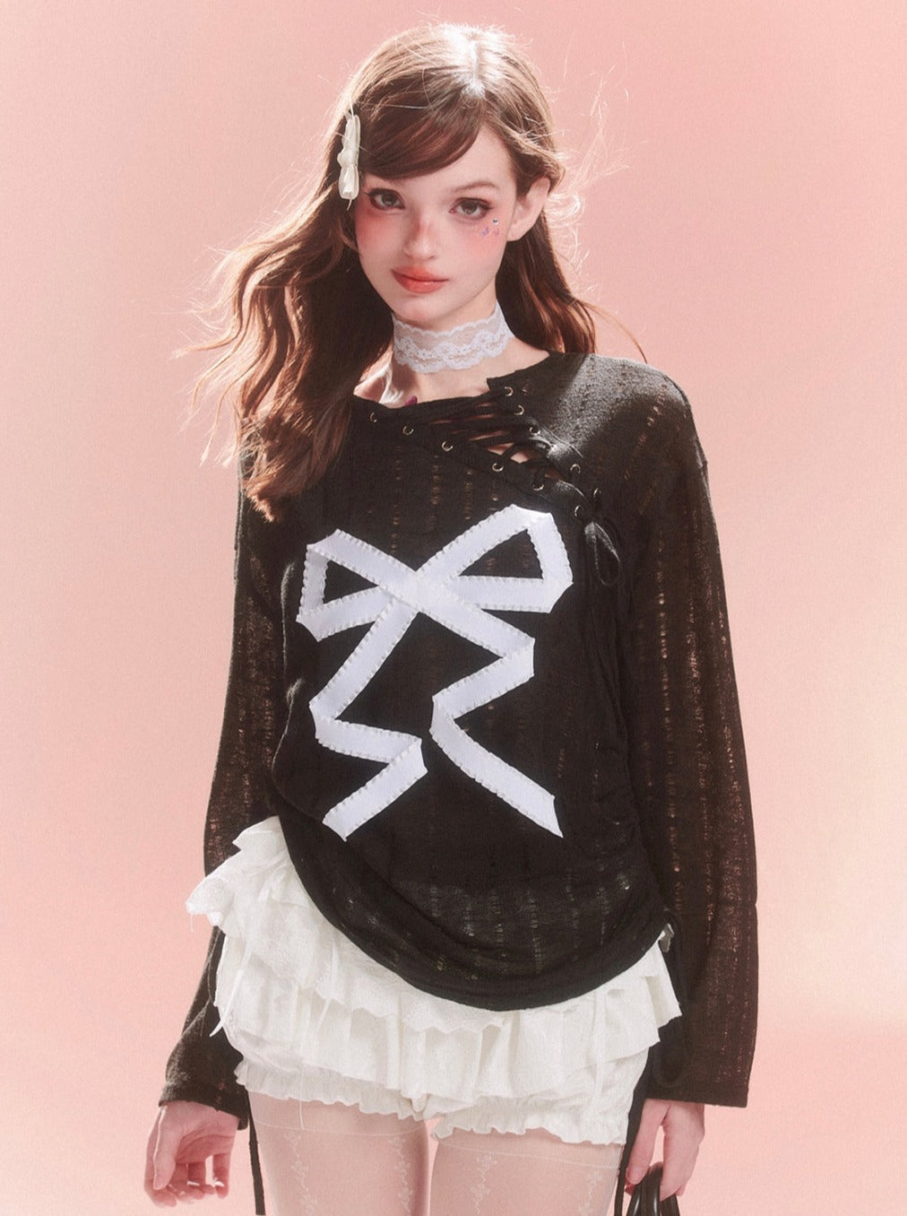 Entfesseln Sie Ihre Niedlichkeit mit unserem transparenten Spitzen-Top mit Schleife! Dieses Top besticht durch sein einzigartiges asymmetrisches Design, das Ihre Figur perfekt betont. Die Schnürdetails verleihen ihm einen Hauch von Verspieltheit und machen es zu einem Must-have für jede trendige Garderobe.