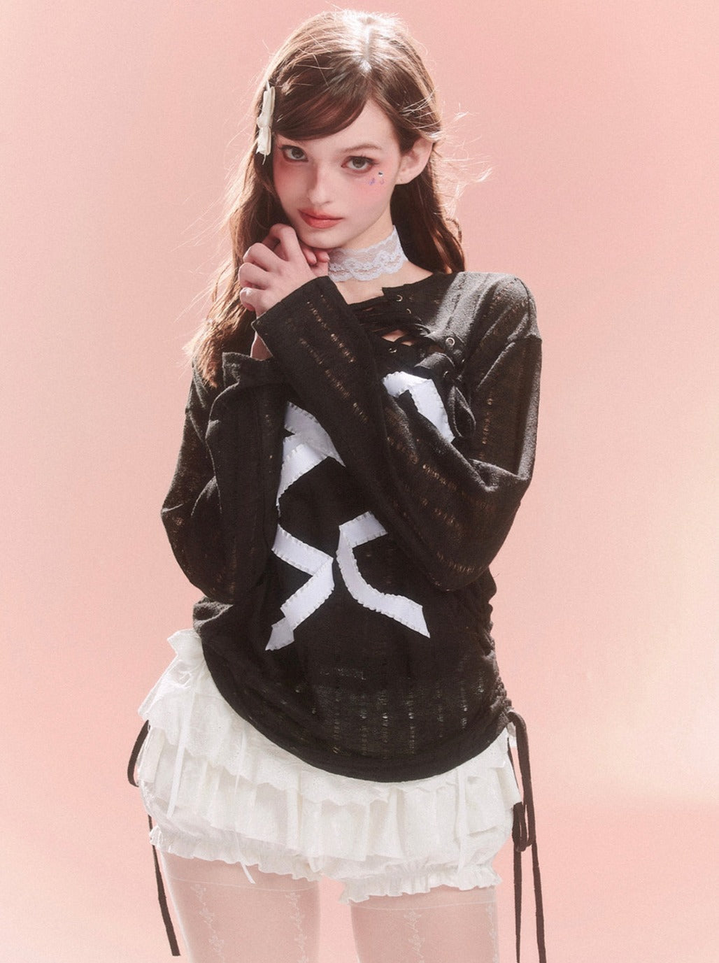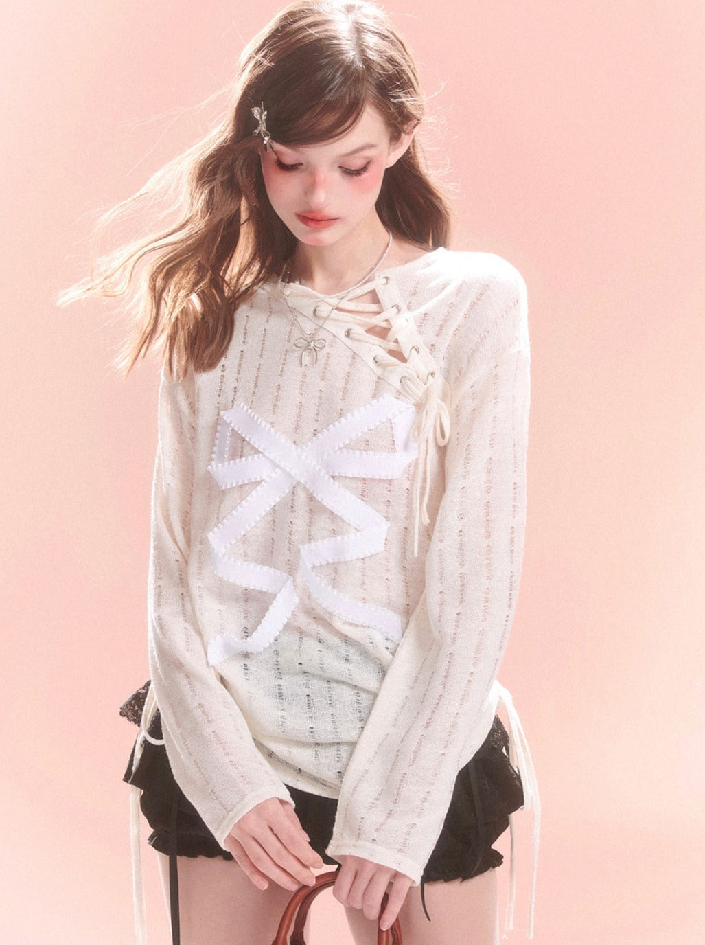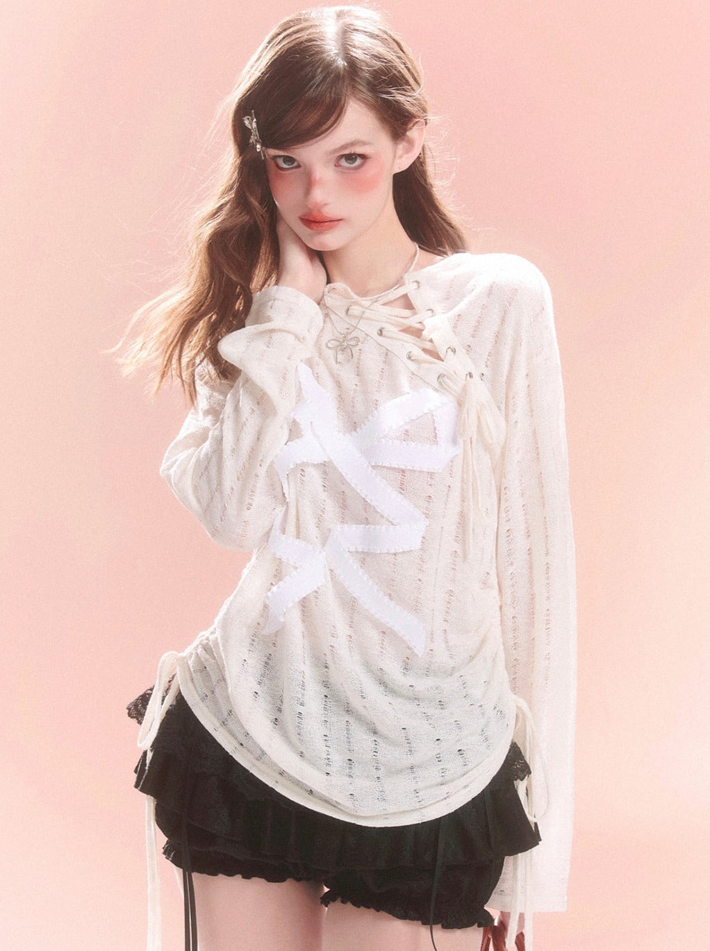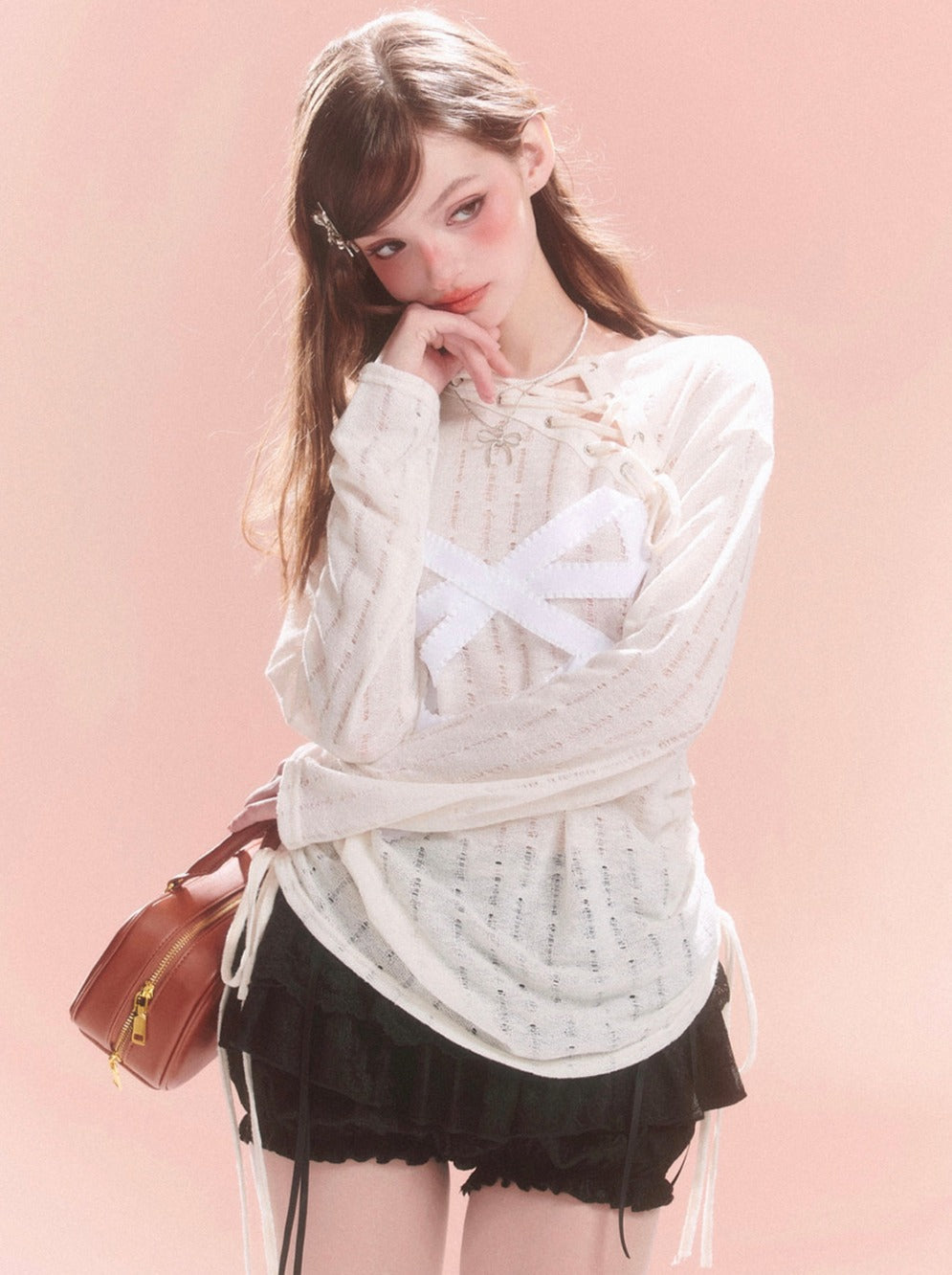 Entfesseln Sie Ihre Niedlichkeit mit unserem transparenten Spitzen-Top mit Schleife! Dieses Top besticht durch sein einzigartiges asymmetrisches Design, das Ihre Figur perfekt betont. Die Schnürdetails verleihen ihm einen Hauch von Verspieltheit und machen es zu einem Must-have für jede trendige Garderobe.
