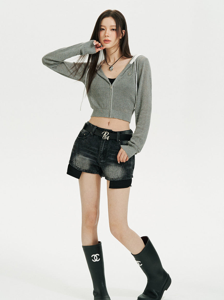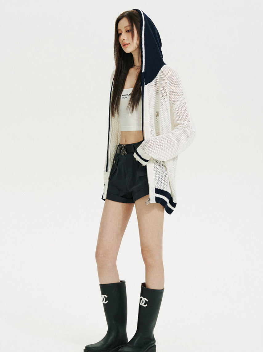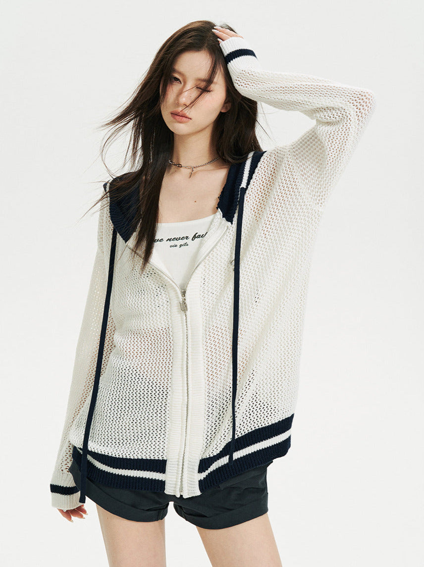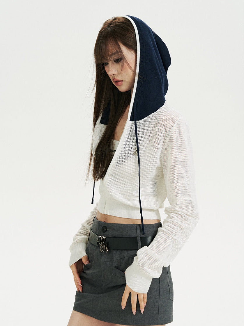 Kurzer/langer Hoodie aus transparentem Netzstrick mit Reißverschluss
