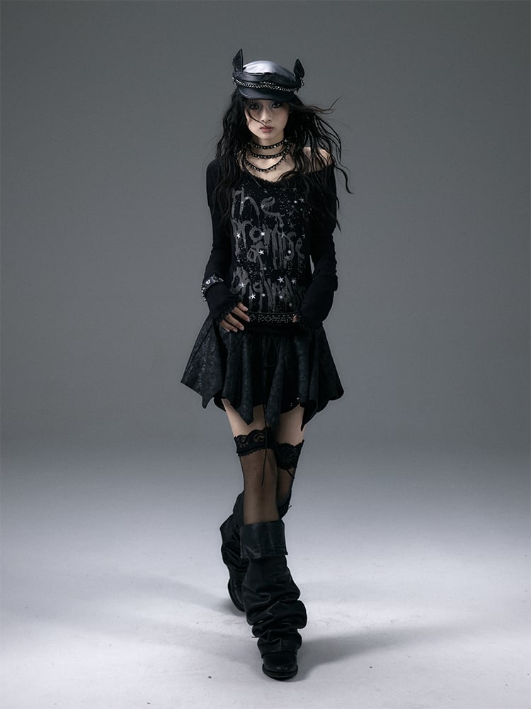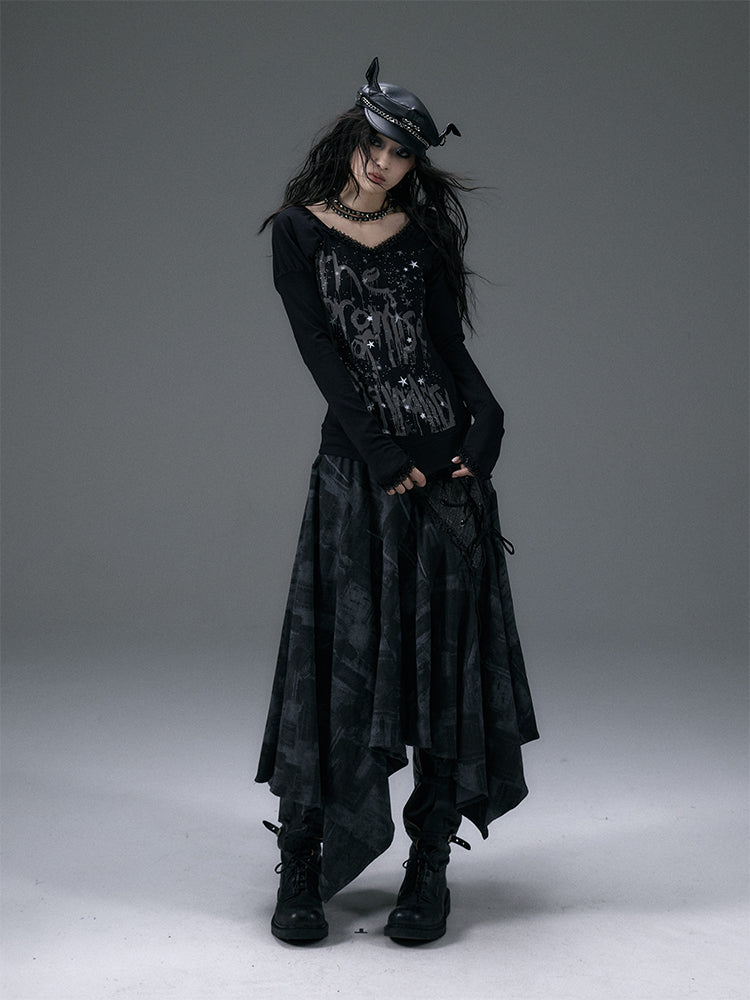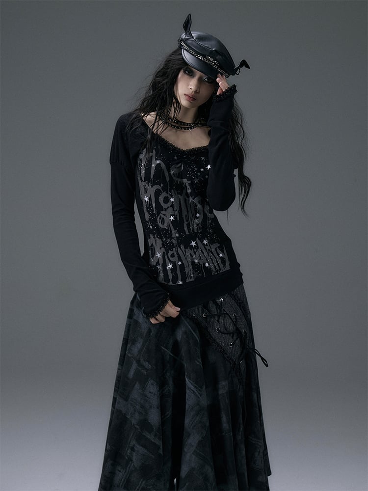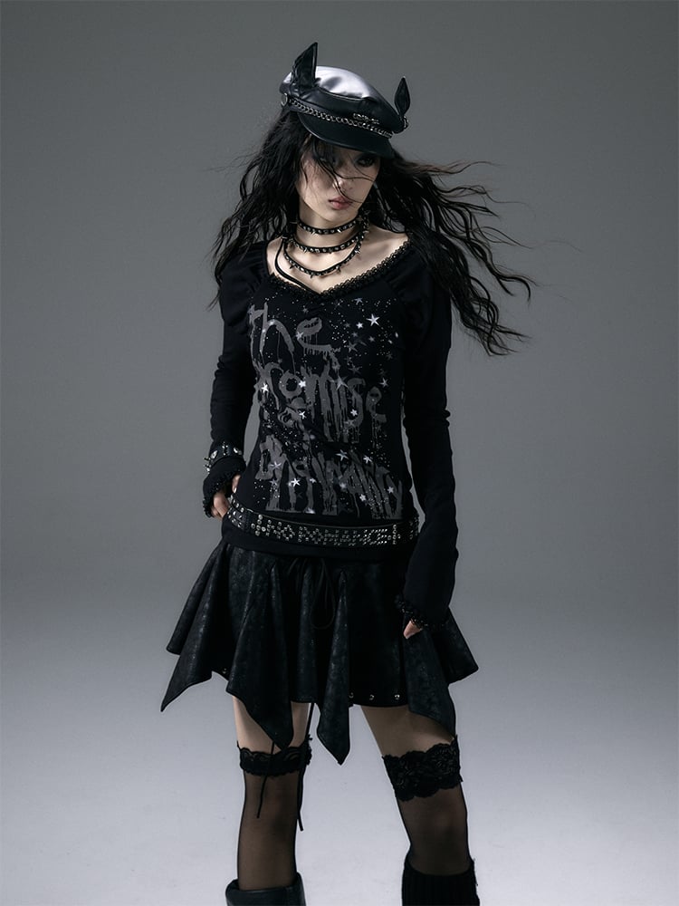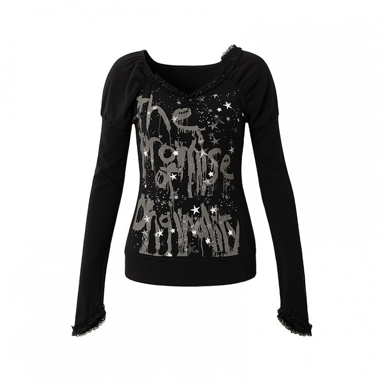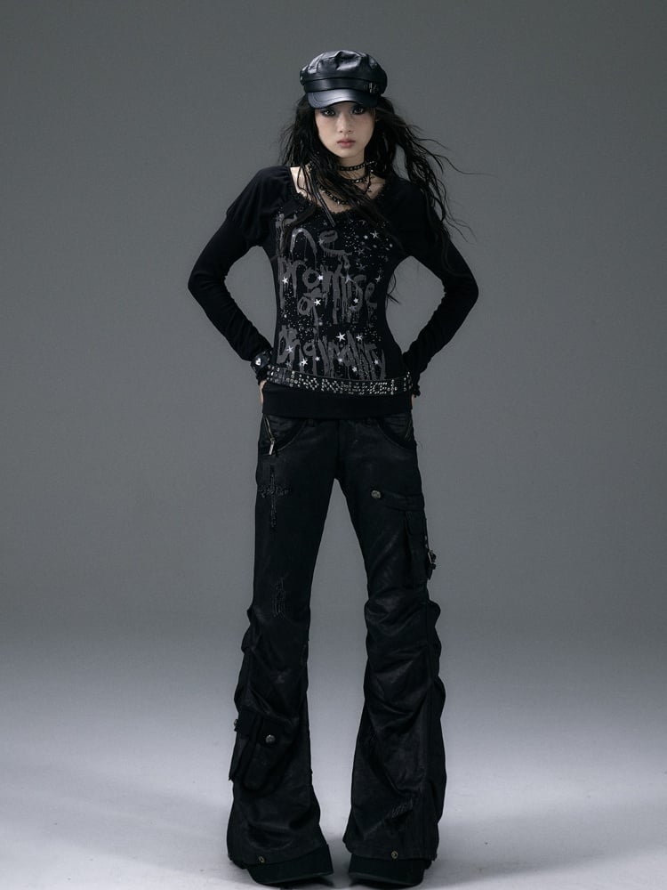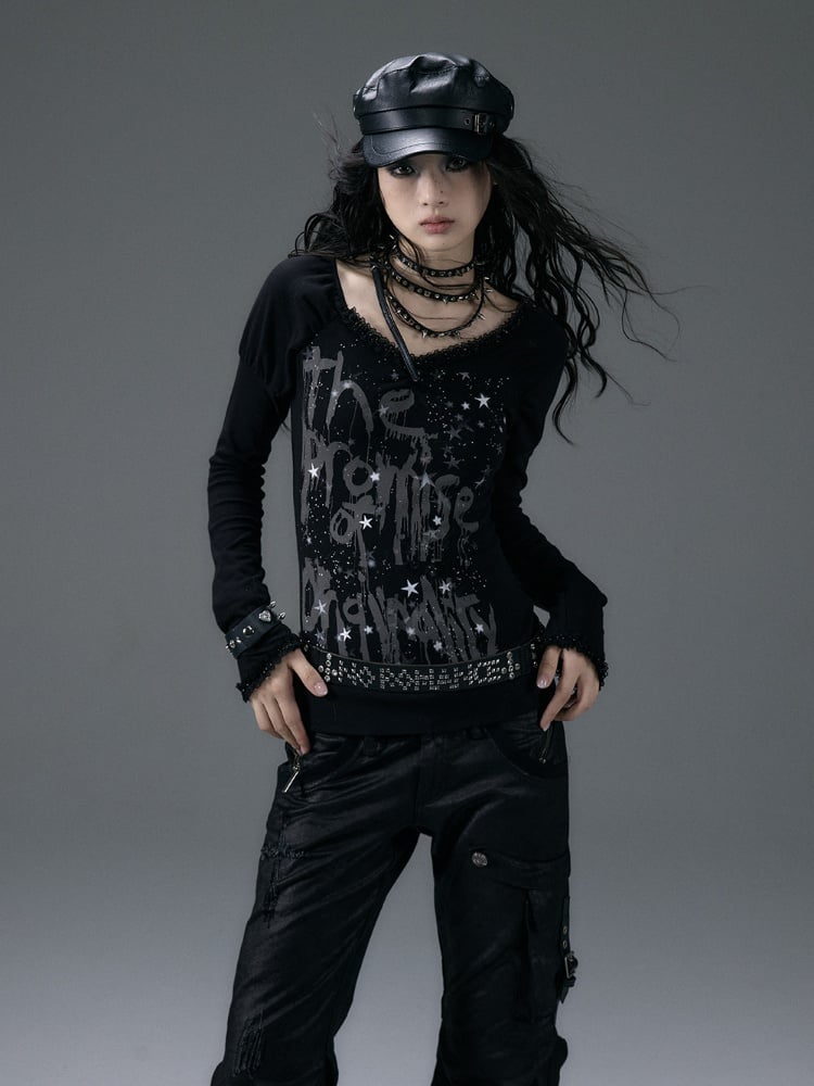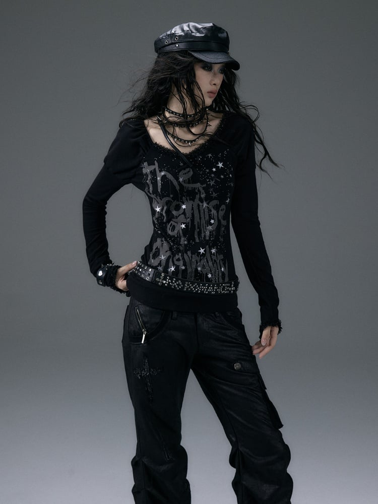 Schwarzes Top mit V-Ausschnitt und schimmernder Sternspitze