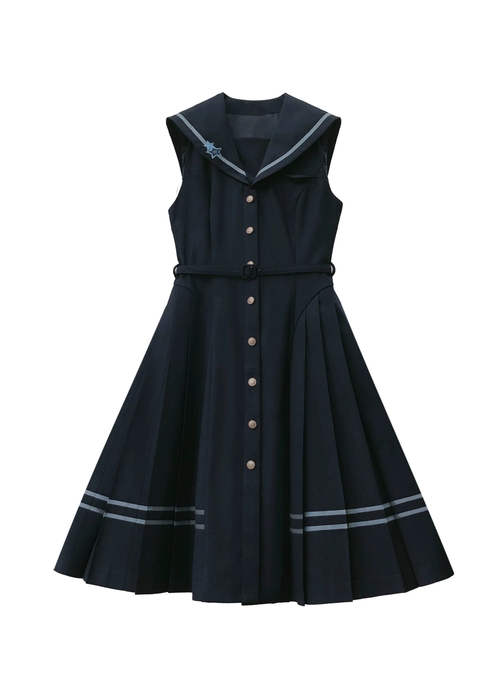 Dieses süße Hemdblusenkleid besteht aus einem plissierten marineblauen Anzug, einem gestreiften Abzeichen und einem magischen Retro-Design. Perfekt für ein bezauberndes und stylisches Outfit, das garantiert für Aufsehen sorgt.