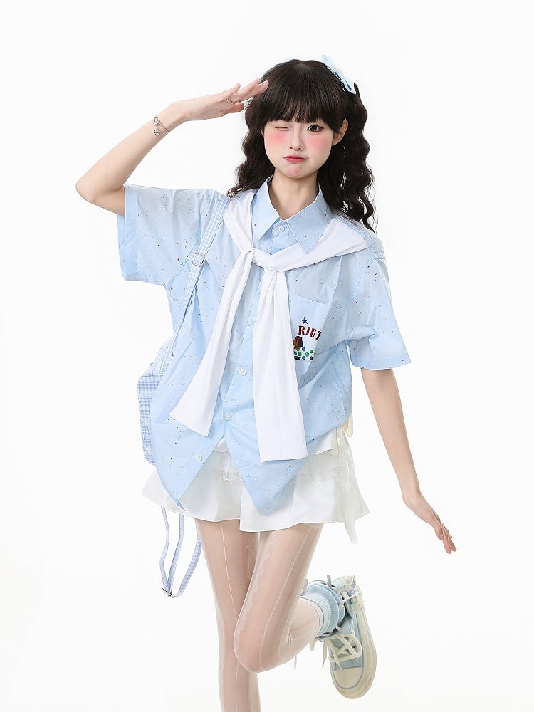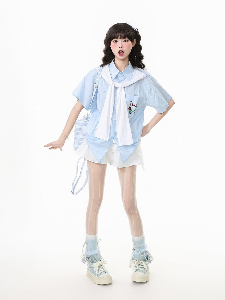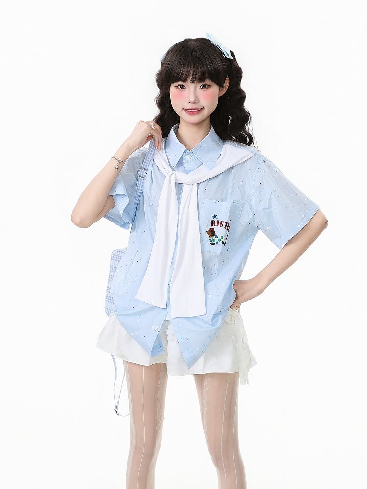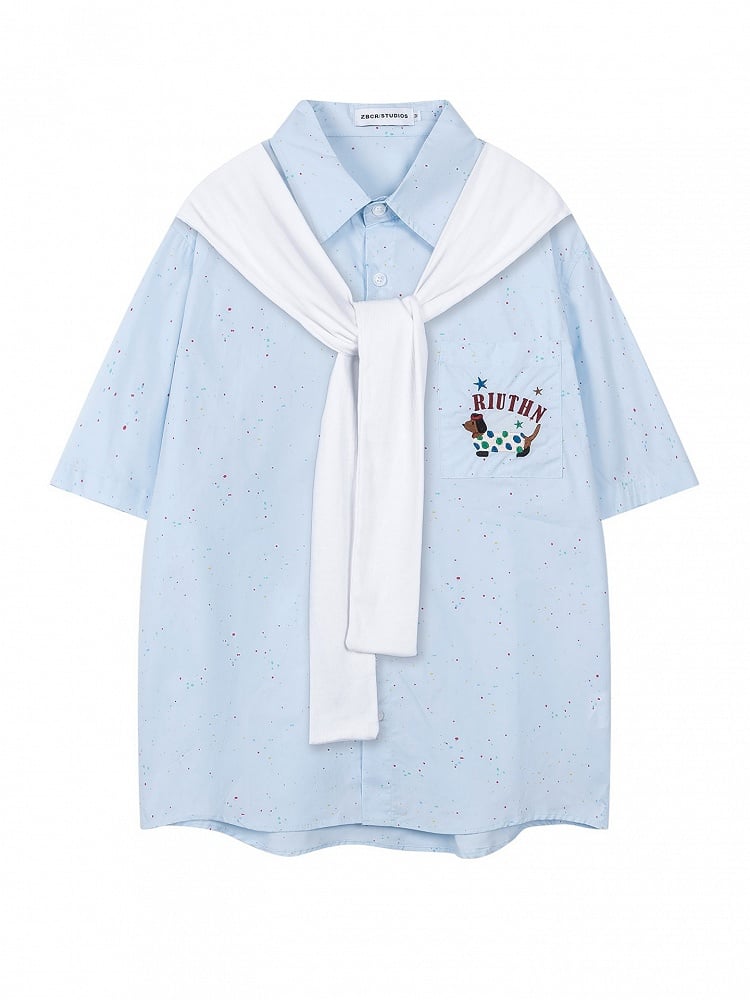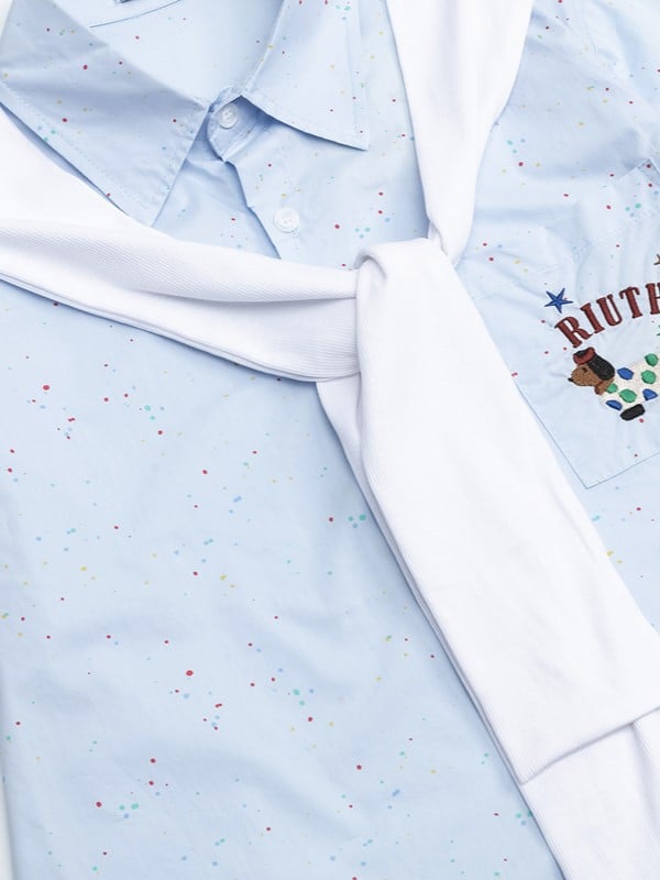 Blaues Hemd mit kurzen/langen Ärmeln, verzierten Kunstärmeln und entzückender Hundestickerei