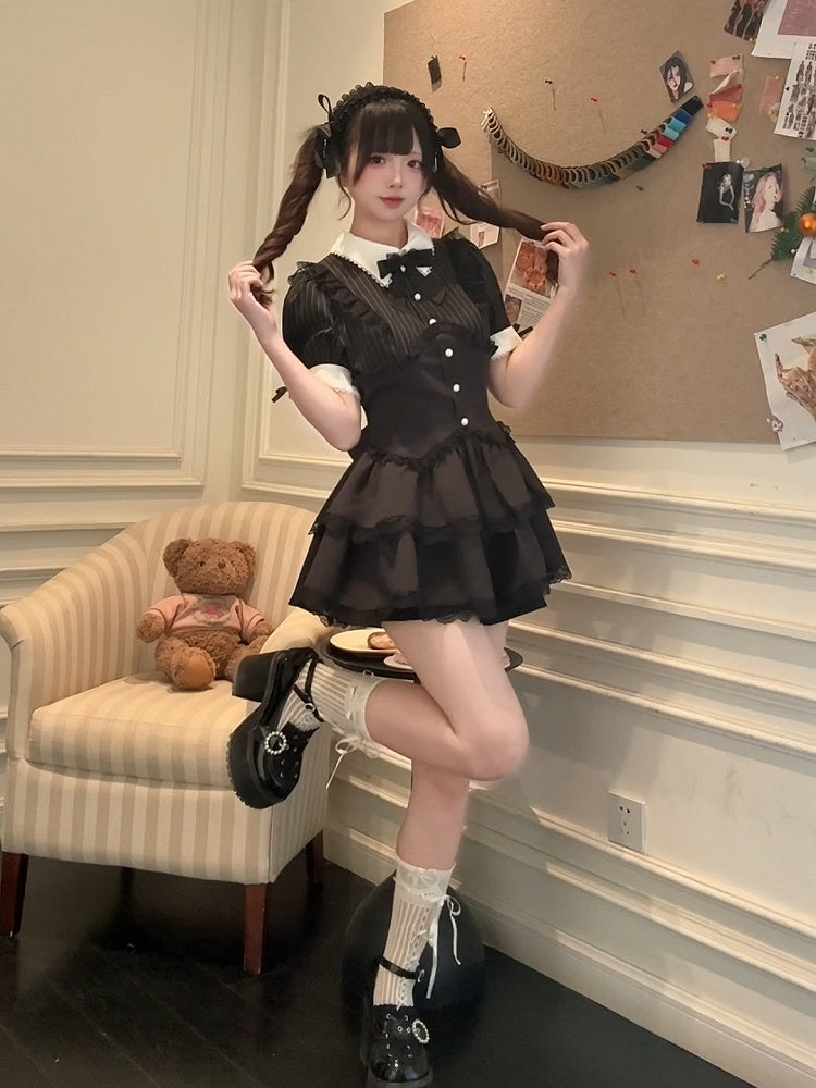 Jirai Kei – Schwarz gestreiftes Set – Zweiteiliges Kunstkleid, Lagenrock, Spitzenbesatz und Shorts
