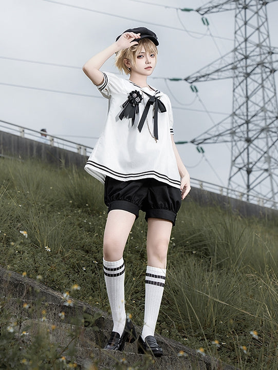 Weißes Kurzarmhemd mit Matrosenkragen und schwarze Shorts