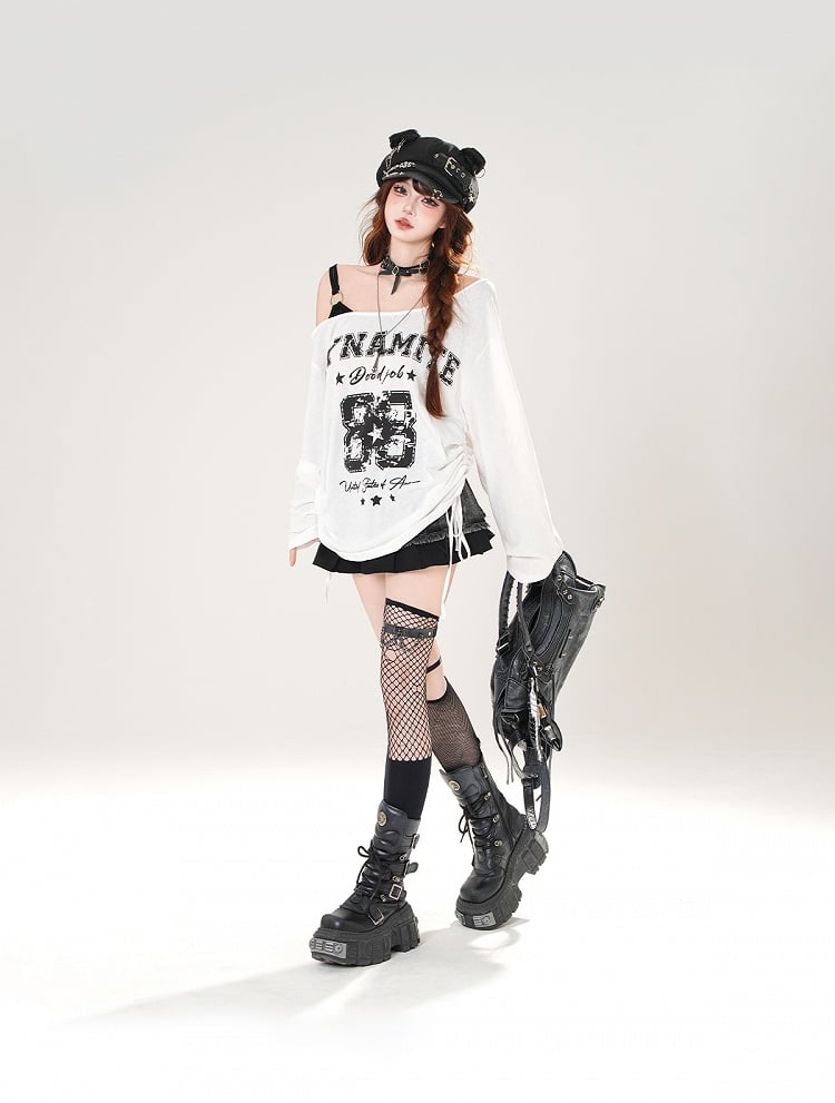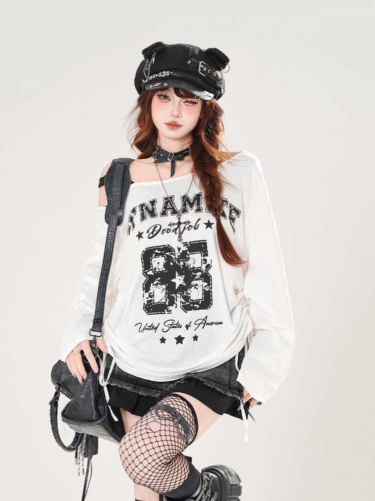Asymmetrischer Ausschnitt, Zahlen- und Buchstabendruck, Kordelzug an der Seite, Weiß/Schwarzes Top