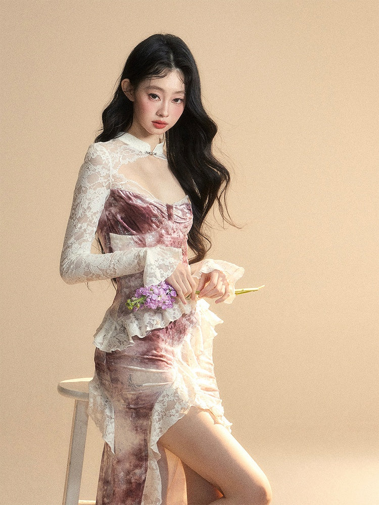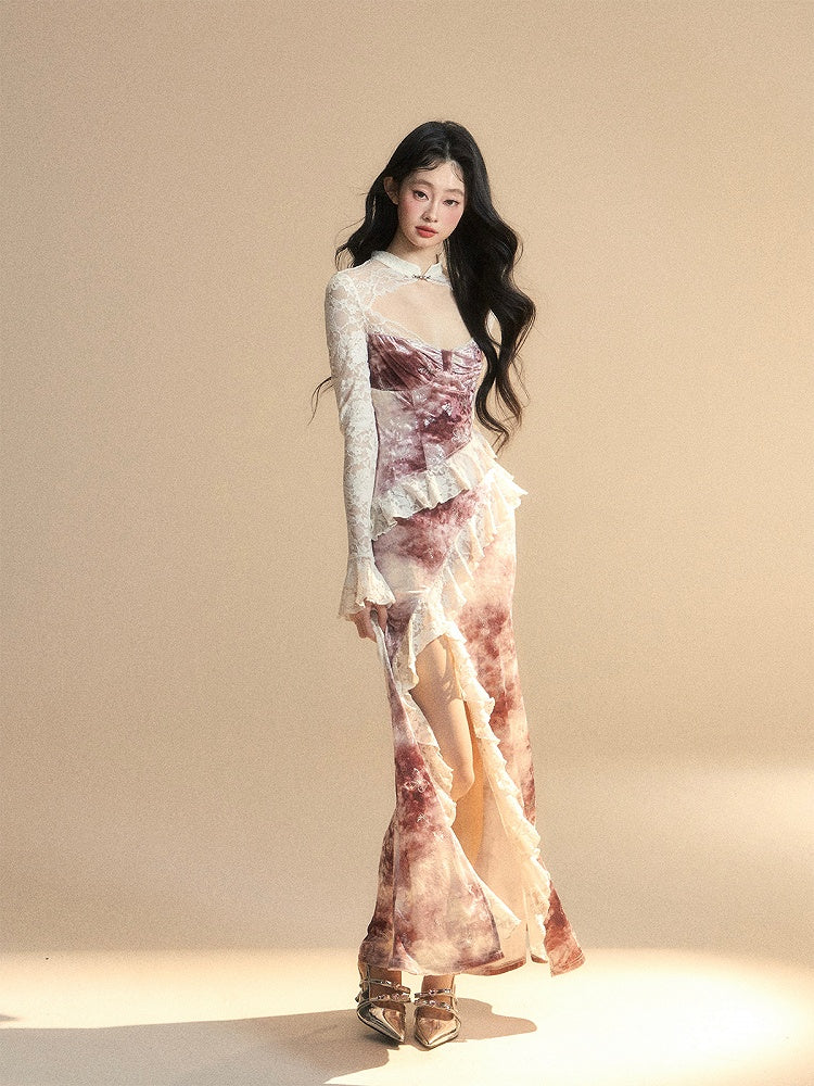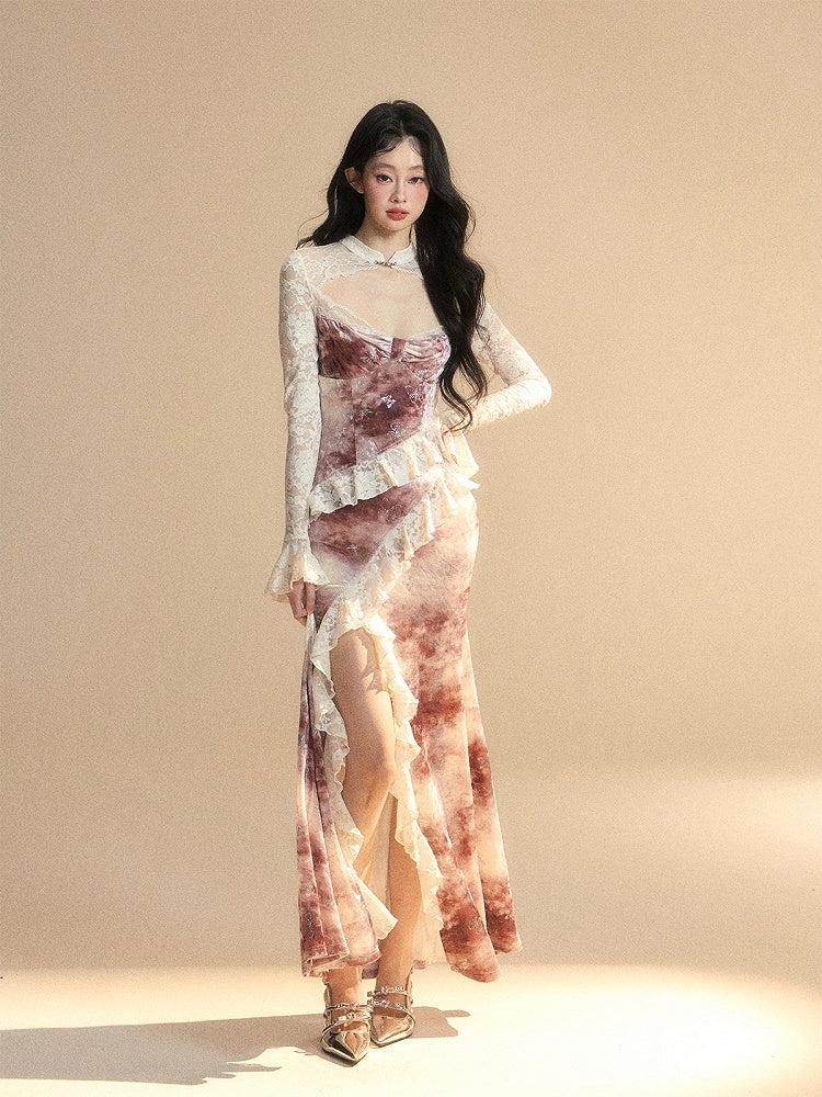 Ziegelrotes Vintage-Kleid mit Spitzenaufnähern, Ausschnitten, Rüschensaum und seitlichem Schlitz