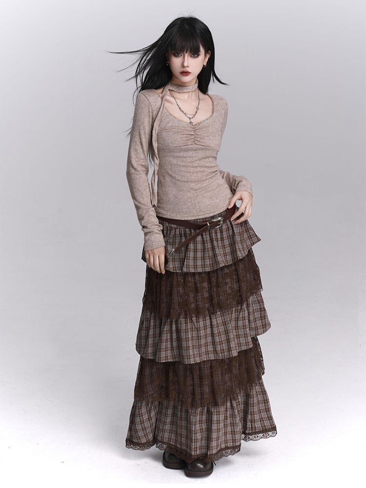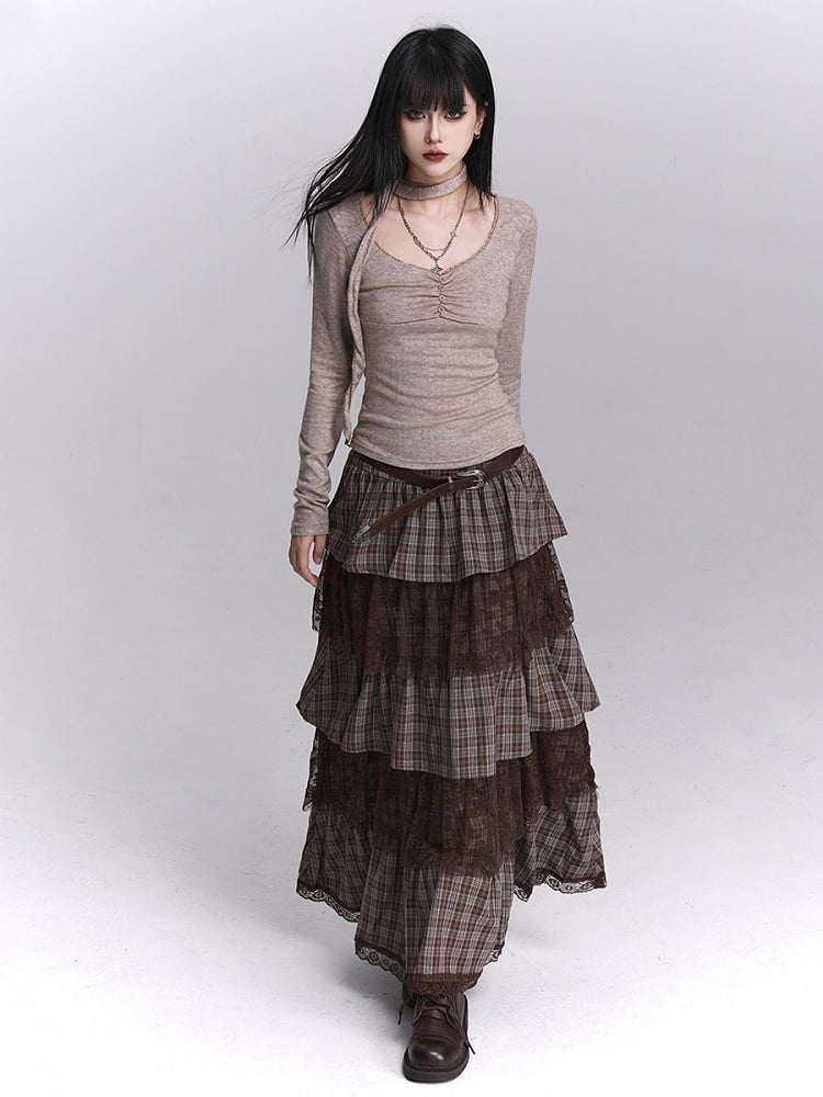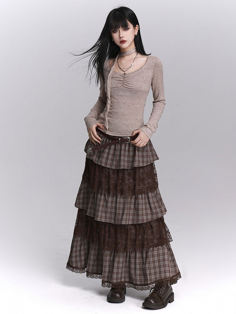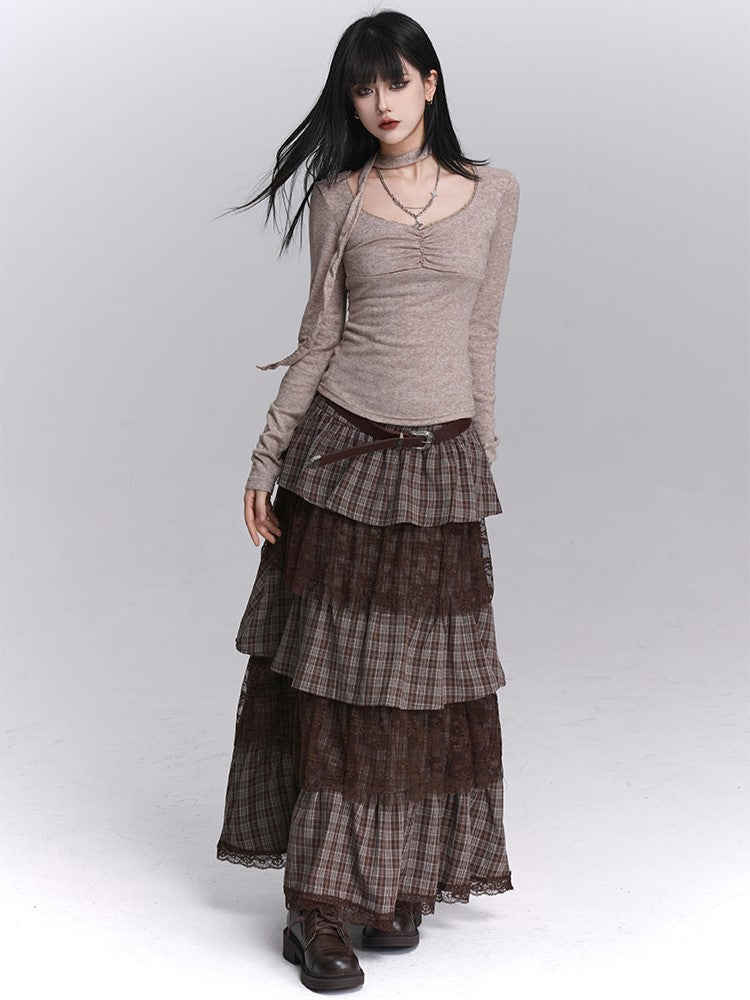 Seitliche Spitzenrockschichten mit Reißverschluss, gestuftes Maxi-Kaffee-Plaid