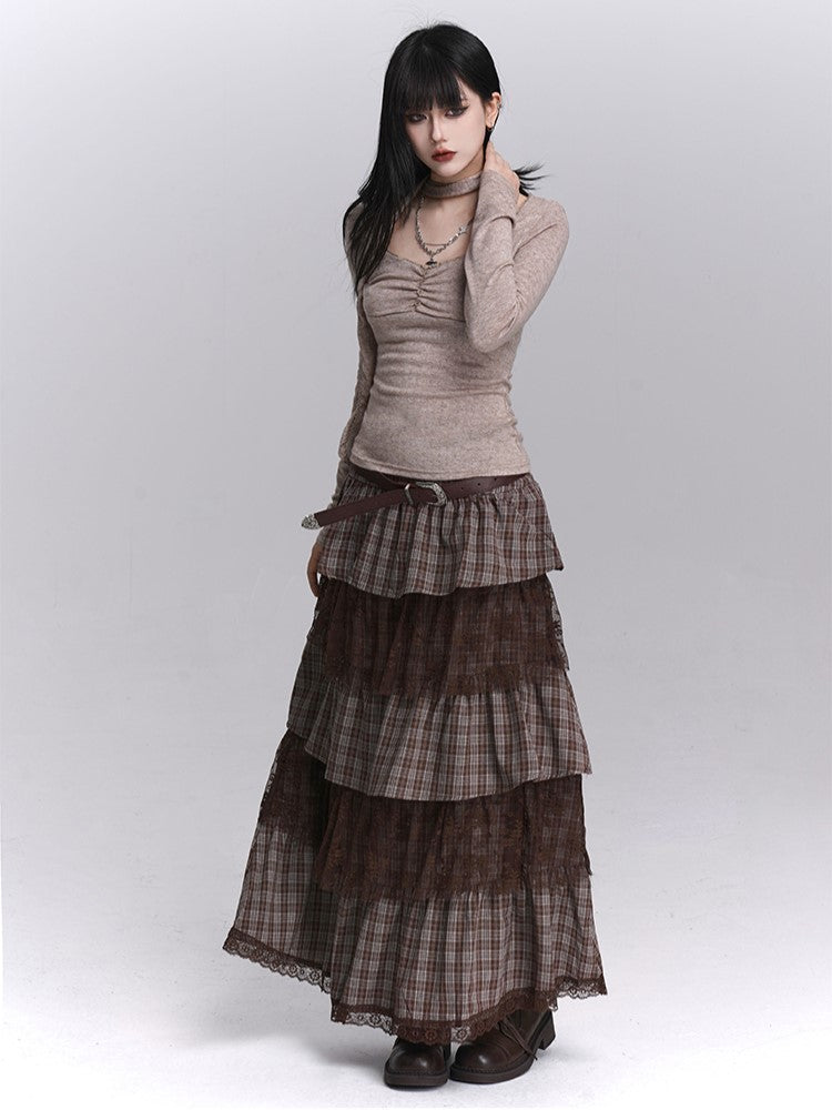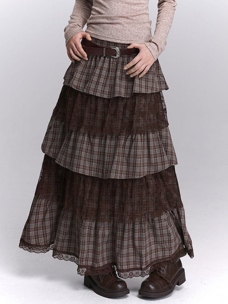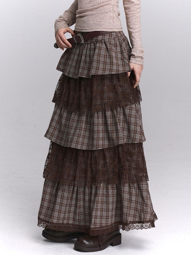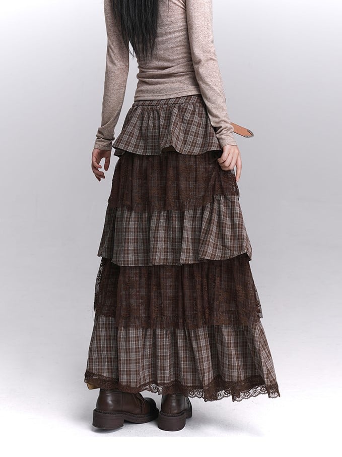 Kaffeefarbener karierter Maxirock mit Spitzen- und Karoschichten und seitlichem Reißverschluss
