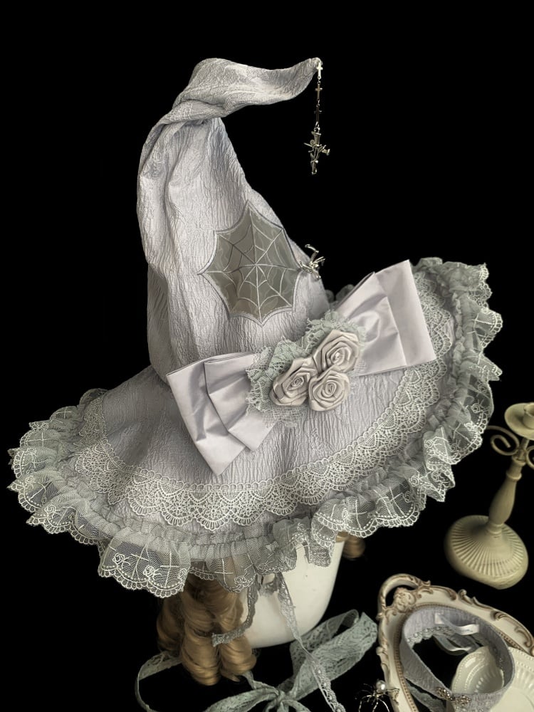 Silbergrauer Hexenhut mit Spinnennetz und Rosenschleife