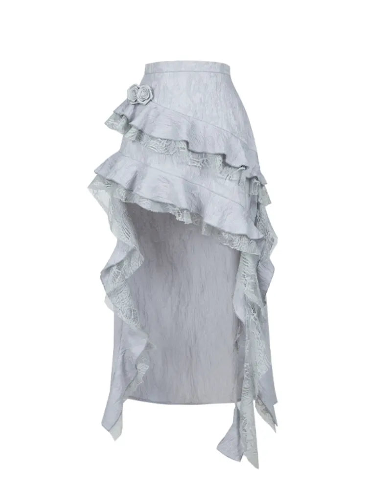 Silbergrauer asymmetrischer High-Low-Rock mit kaskadierendem Rüschenbesatz