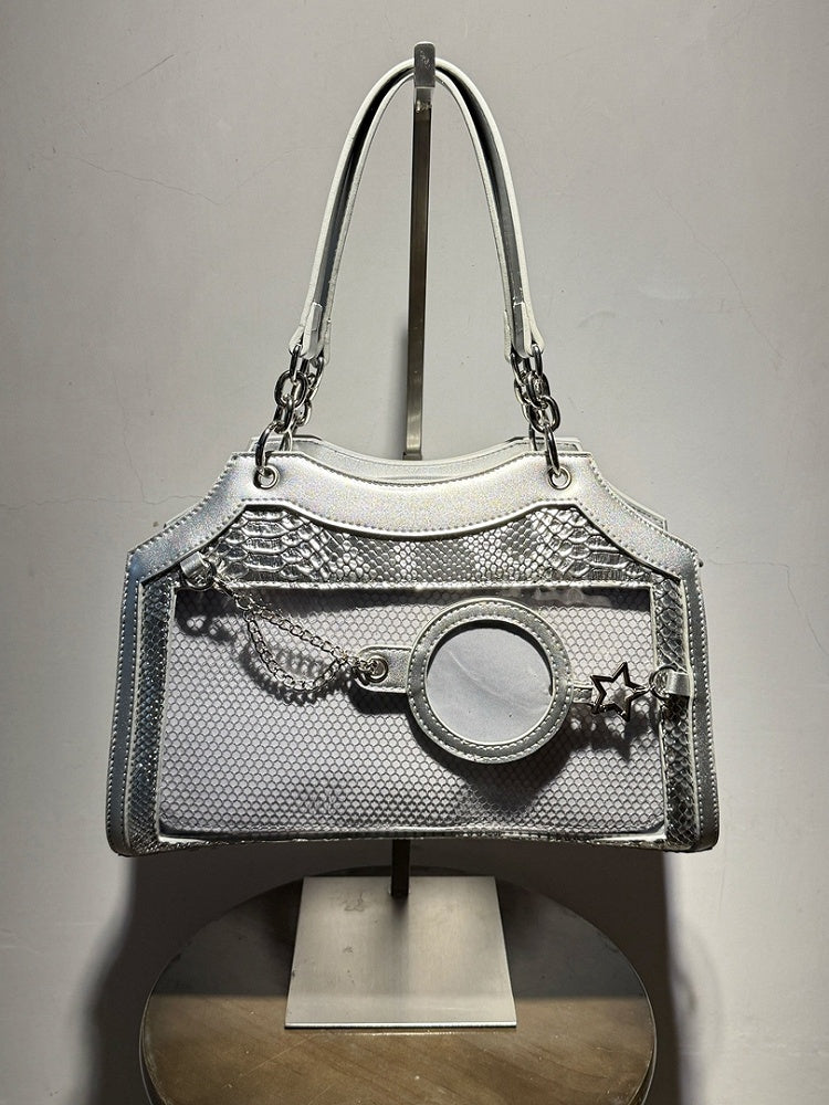 Erweitern Sie Ihre Accessoire-Auswahl mit dieser schicken silbernen Ita-Umhängetasche aus PU – perfekt für Fans von Kawaii- und Lolita-Mode. Gefertigt aus hochwertigem PU-Material bietet diese Tasche sowohl Haltbarkeit als auch Stil. Ihr schimmernder Silberton verleiht ihr einen Hauch von Eleganz, während die transparente Vordertasche es Ihnen ermöglicht, Ihren Look zu personalisieren, indem Sie Ihre Lieblings-Pins, Schlüsselanhänger oder Sammlerstücke präsentieren. Ob Sie zu einer Convention gehen oder einfach nur einen Tag voller Spaß verbringen möchten, diese Ita-Tasche ist ein Must-have für Ihre Garderobe.