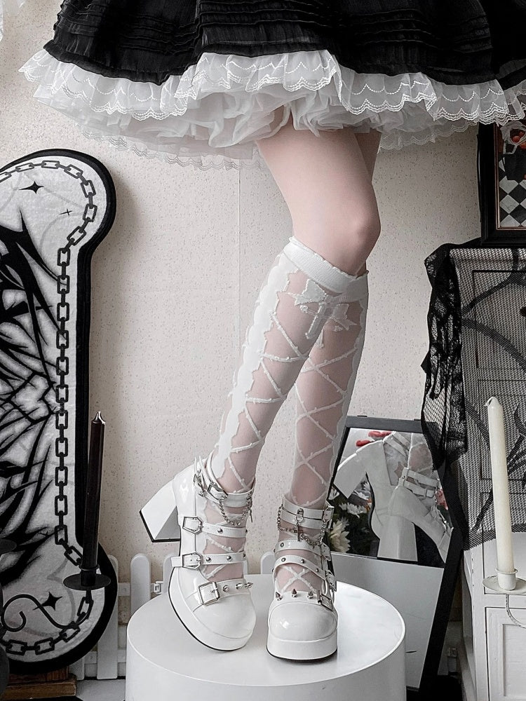 Tauchen Sie mit diesen bezaubernden Plateauschuhen in die Welt gotischer Eleganz ein. Mit ihren einzigartigen sargförmigen Schnallen und silberfarbenen Nieten versprühen diese Schuhe einen dunklen, geheimnisvollen Charme. Die aufwendigen Kreuz- und Kettendetails verleihen dem Schuh zusätzliche Eleganz, während der robuste Knöchelriemen für einen sicheren und bequemen Sitz sorgt. Der Blockabsatz sorgt für Komfort und Stabilität und macht diese Schuhe perfekt für den ganztägigen Einsatz.