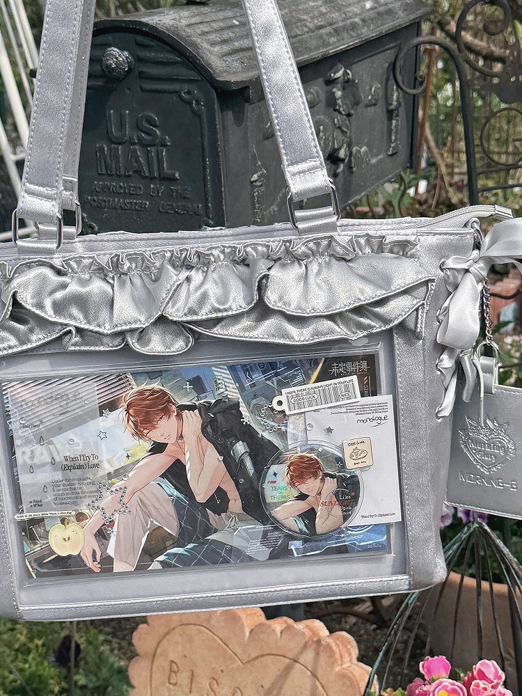 Ita-Tasche aus silberfarbenem Satin mit Rüschenbesatz und selbstbindenden Trägern und Kartenhalter mit Schleife