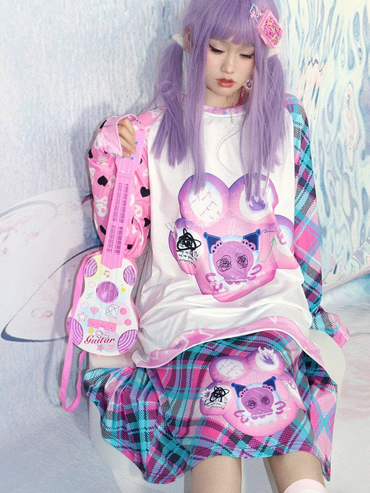 Grün-pinker Y2K-Rock mit Katzenkrallen-Print und Karomuster