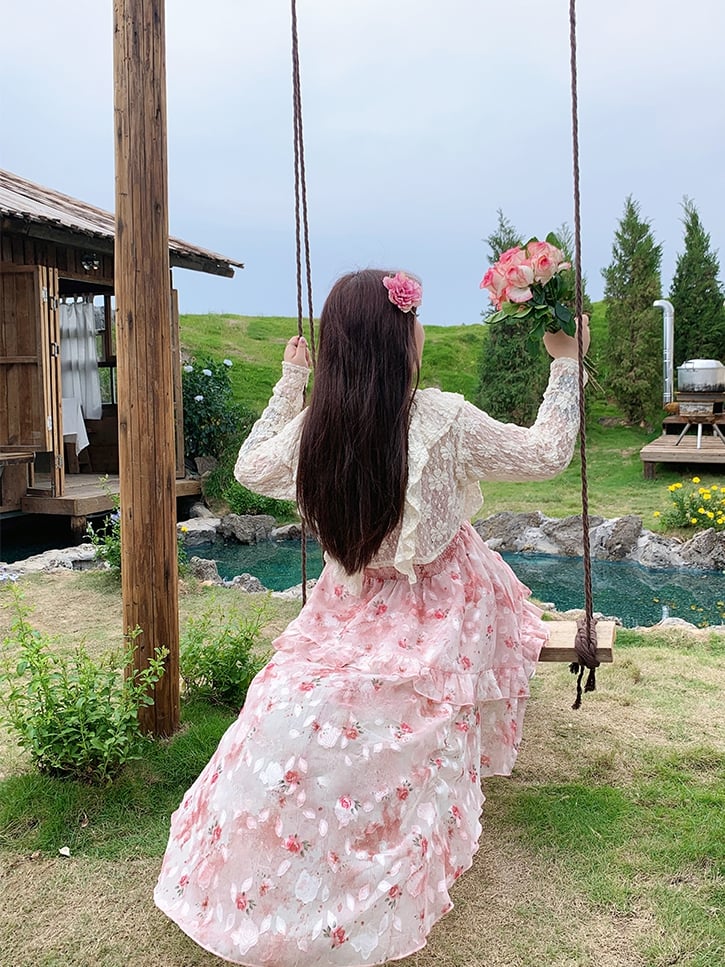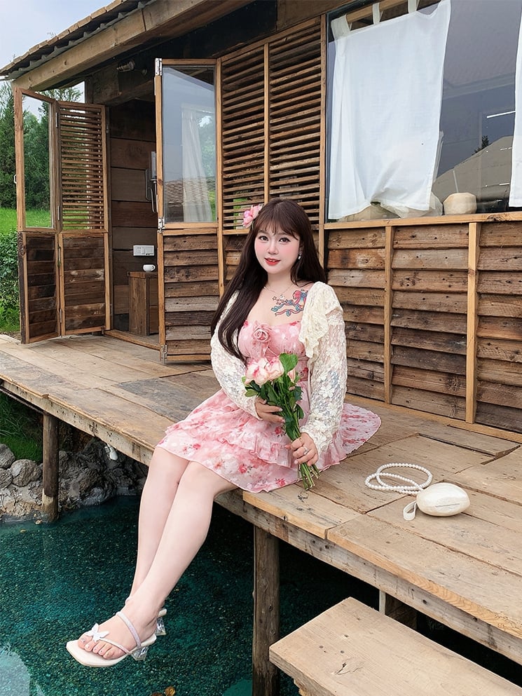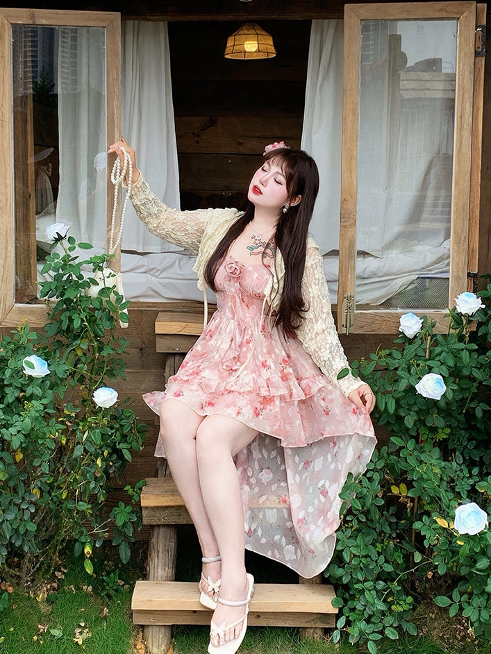 Rock High-Low-Rosettendruck Camisole Rosa Rüschen Übergröße Baskentaille Kaskadenkleid