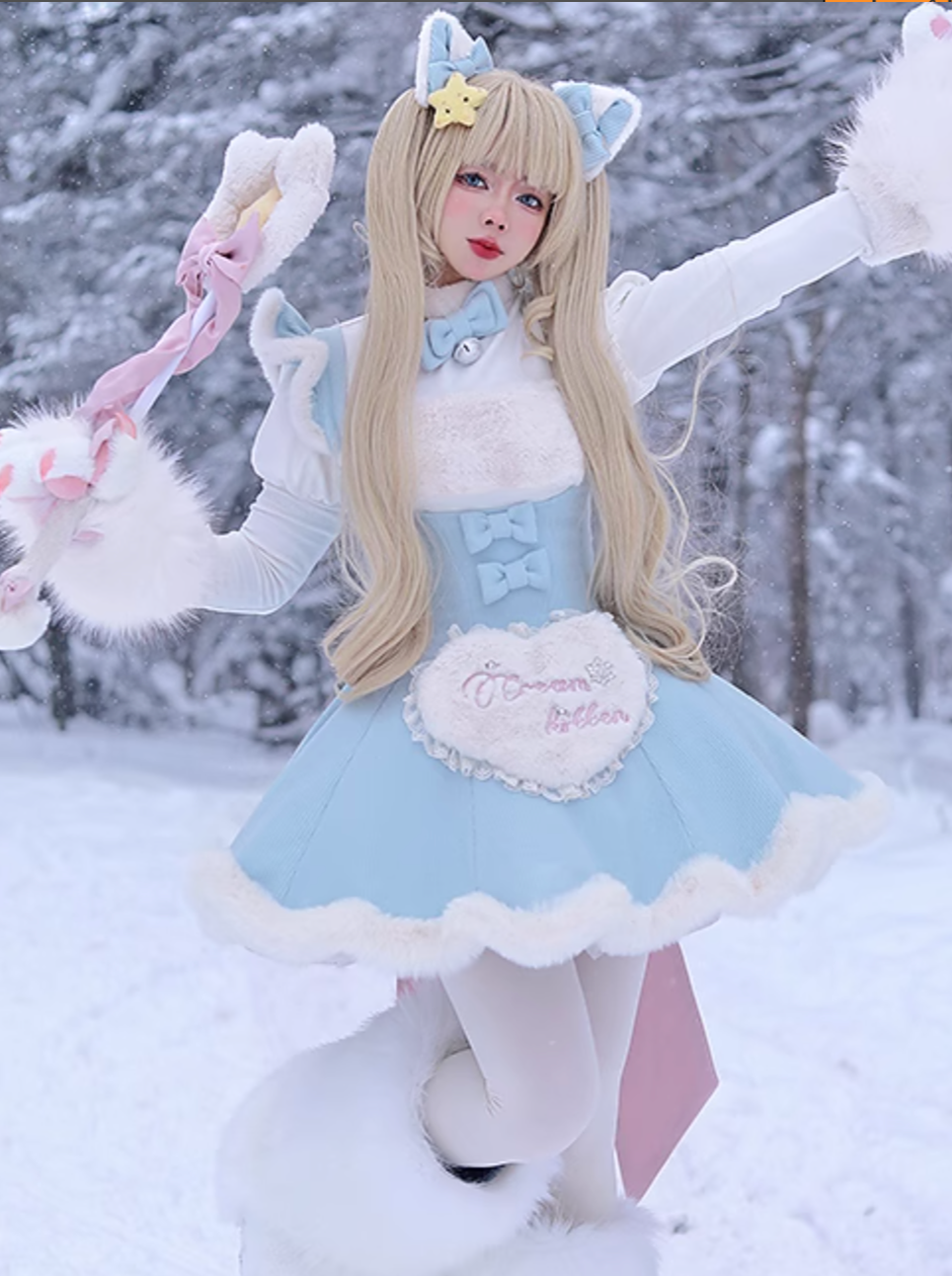 Blau-weißes Old School Lolita Fashion Kleid mit Schleife und Details, JSK-Set
