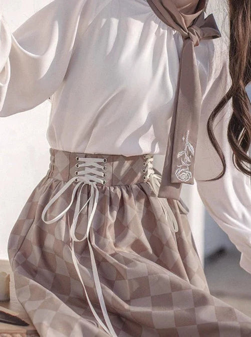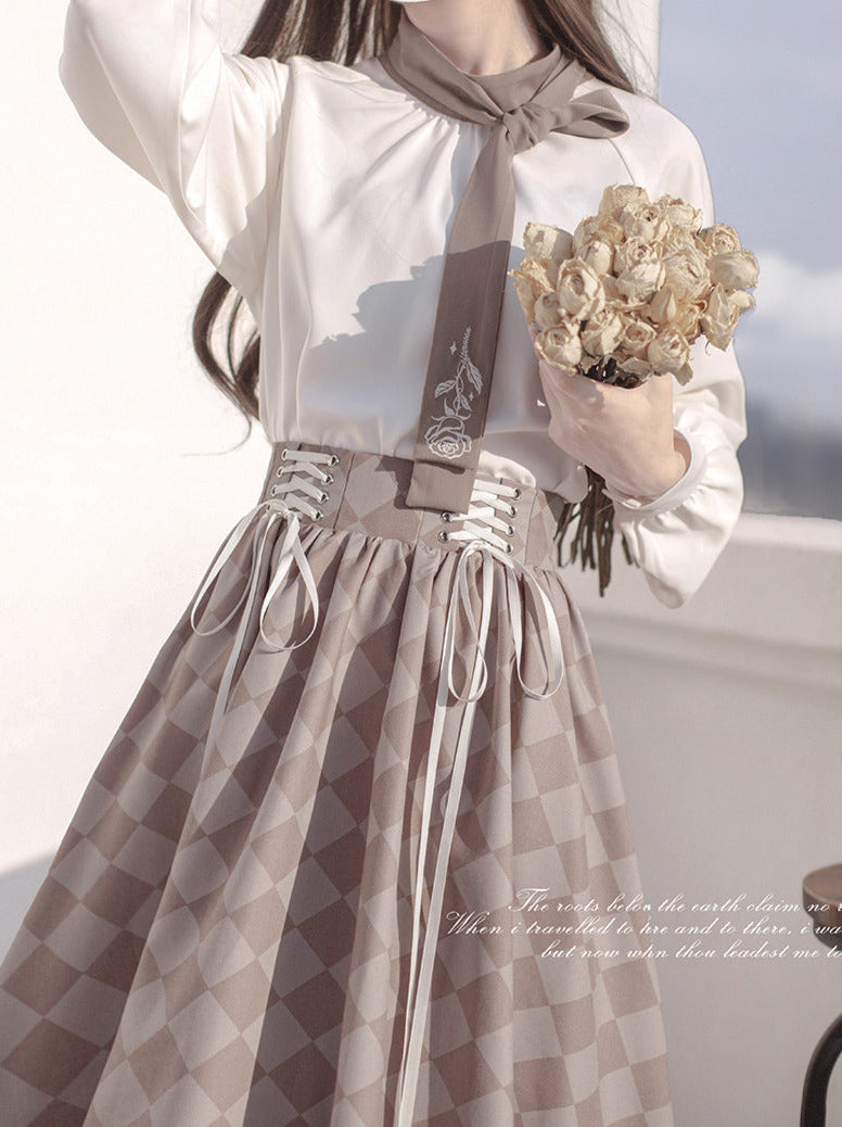 Kurzer Rockanzug + Hemd mit Rosenkaromuster + Retro-Krawattenbrosche + Schleife, französische Jacke mit Schnürung