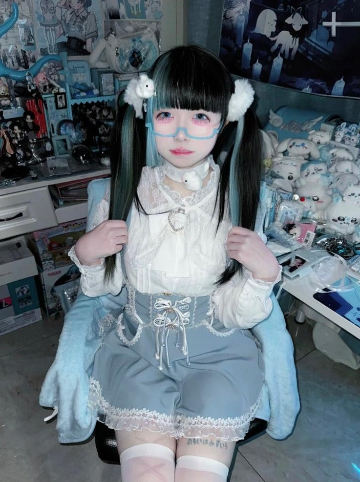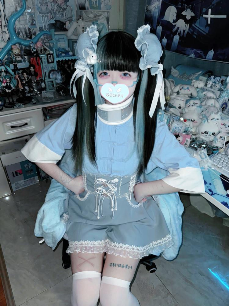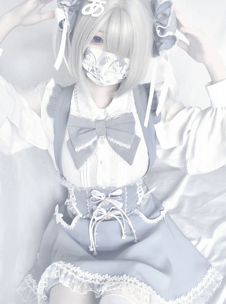 Blau-weißes Old School Lolita Fashion Kleid mit Schleife und Details, JSK-Set