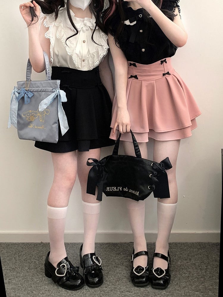 Ärmel Bow Kei und Flatter mit Krawatte Jirai Herzförmige Trim Bluse Schwarz/Weiß Flügelspitze