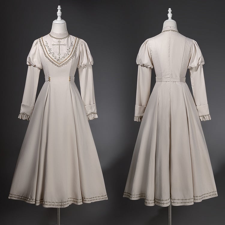 Beige Nun Lolita Juliette Sleeves Dress + Shimmer Red Embroidered Royal Cloak + Rope Accessory