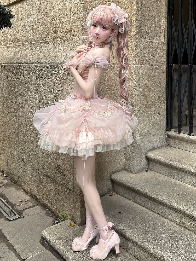 Rosa Balletcore-Prinzessin-Lolita-Outfit, Puffärmel, Korsettoberteil mit Stäbchen + mehrlagiger Rüschenrock