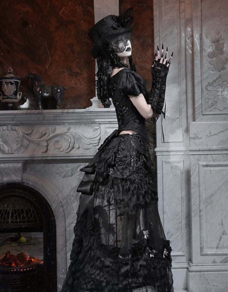 Sleeves Top Puff Edwardian Off-the-shoulder Vintage Neckline and Black